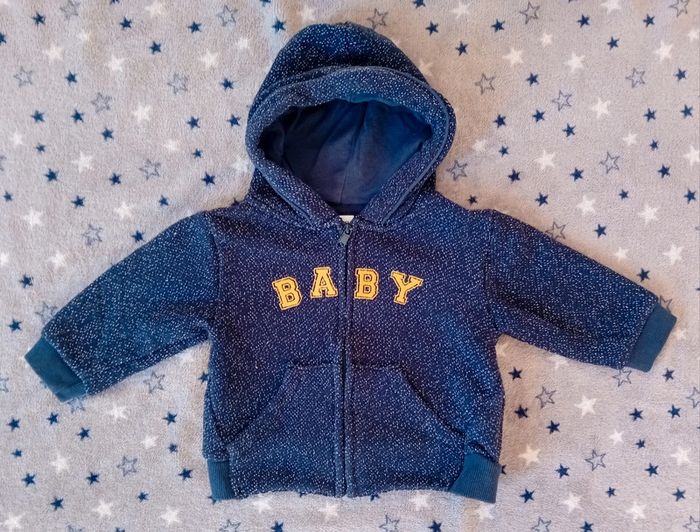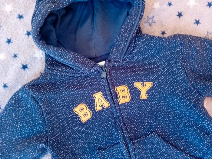 Gilet Tape à l'Oeil taille 6 mois en très bon état comme neuf couleur bleu marine écriture jaune à fermeture éclair
