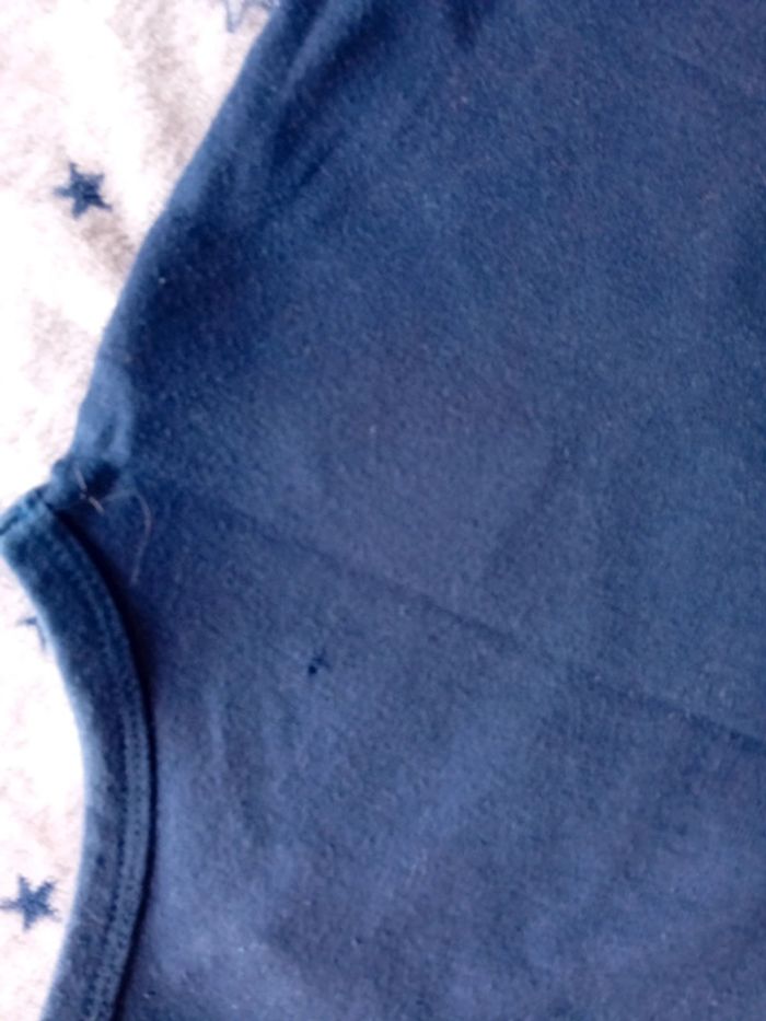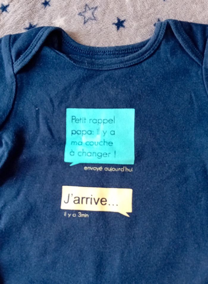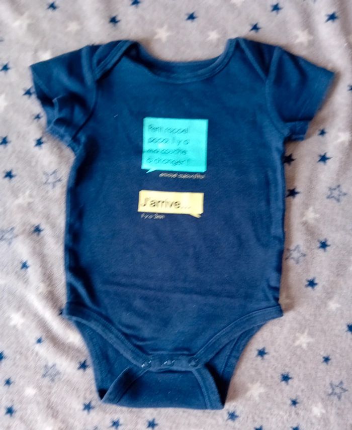 Lot de 3 bodies Gémo taille 18 mois en bon état couleur bleu marine blanc et bleu turquoise ( bodie bleu marine à un petit trou au dos voir dernière photo et bodie blanc avec écriture à une petite tâche très légère qui ne voit presque pas voir avant dernière photo)