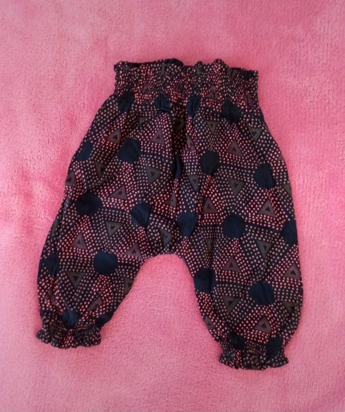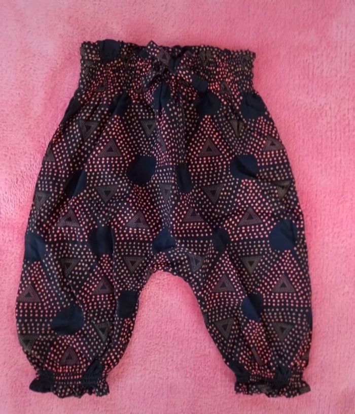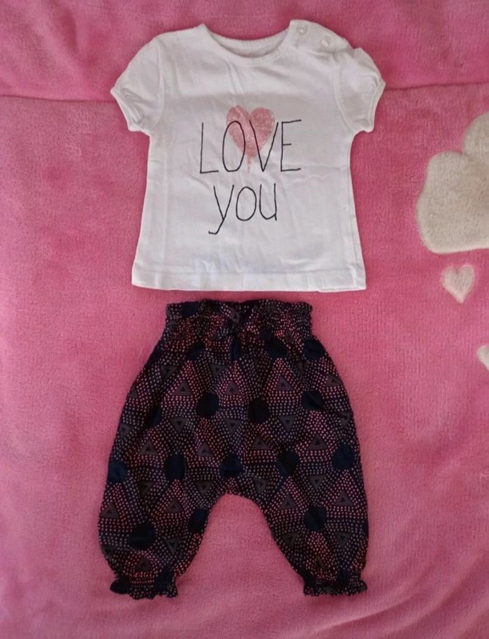 Ensemble Kiabi taille 3 mois en très bon état composé d'un pantalon léger couleur noir et rose et d'un t-shirt couleur blanc motif rose (petit accro en bas du t-shirt voir dernière photo)