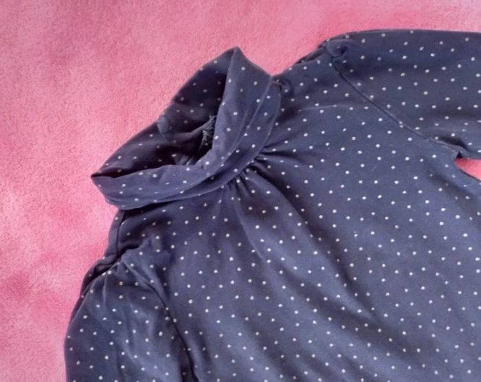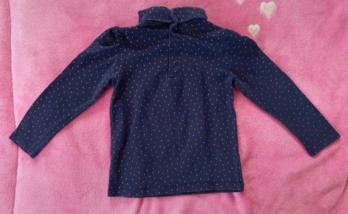 T-shirt Kiabi taille 3 ans en très bon état avec col roulé couleur bleu marine à pois argenté
