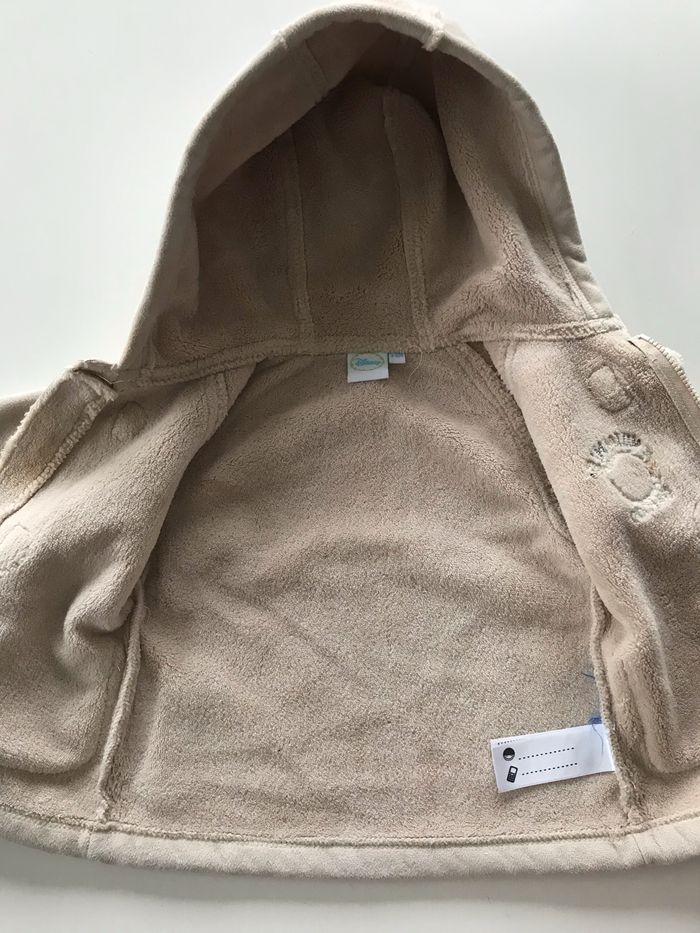 Manteau bébé Winnie beige tout doux 100% polyester, à capuche. Fermeture éclair et bouton. Taille 3/6 mois