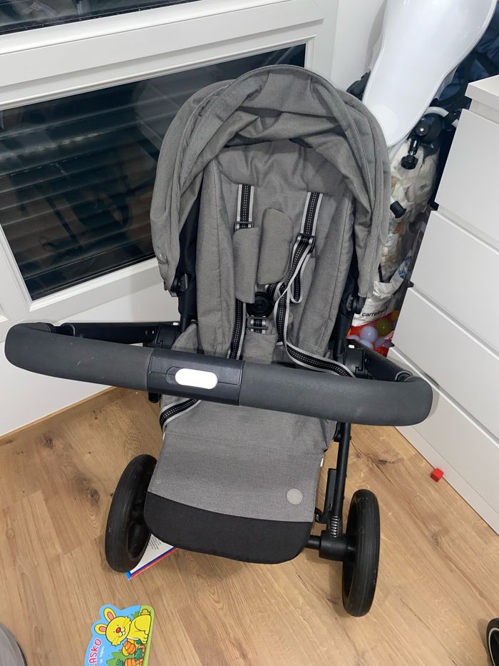 Je vends la poussette + le cosy avec ses adaptateurs + la base isofix pour le cosy et le futur siège auto. Le panier est au lavage d’où le fait qu’il ne soit pas sur la poussette mais il es bien vendu avec, pareil pour la barre du devant de la poussette, elle es dans ma voiture. Elle est complète. Il y a quelques traces d’usures sur le châssis, mais sinon fonctionne parfaitement bien. Je l’ai acheter en 2022. Elle se plie facilement, avec une poignée et vous avez même un crochet de sécurité pour éviter qu’elle ne s’ouvre pendant que vous la ranger.