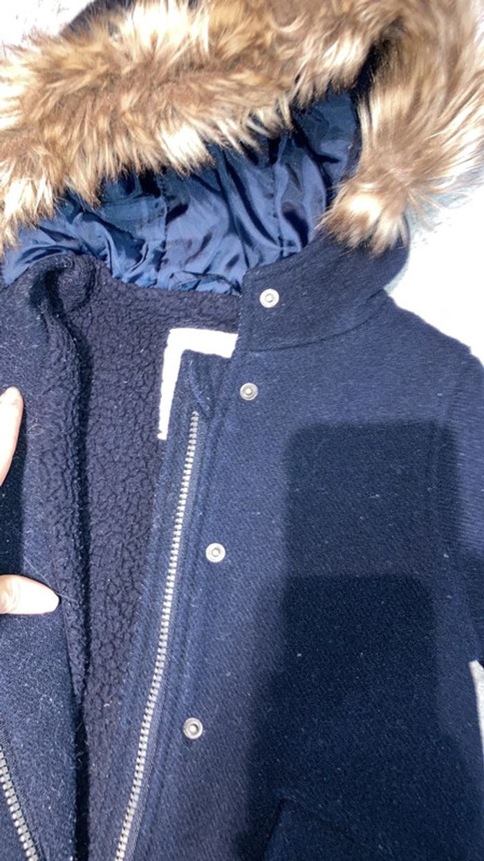 Manteau chaud hiver pour fille. De couleur marine. En bon état. Au vue de la matière il est statique. 44% laine