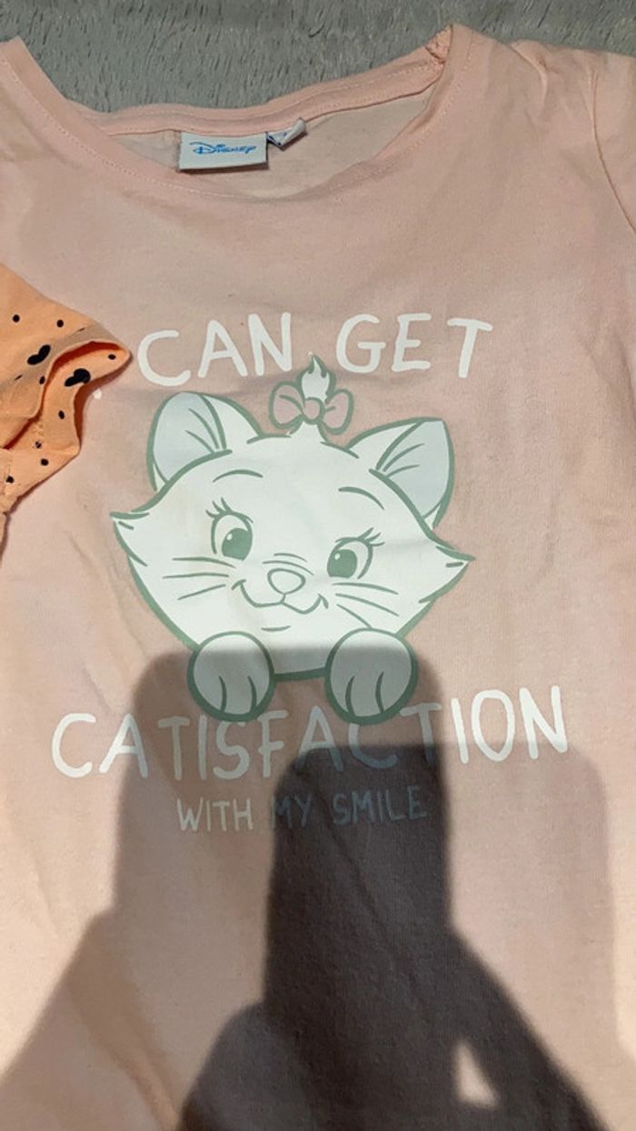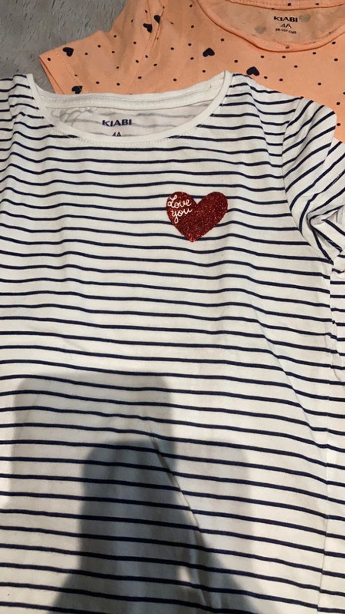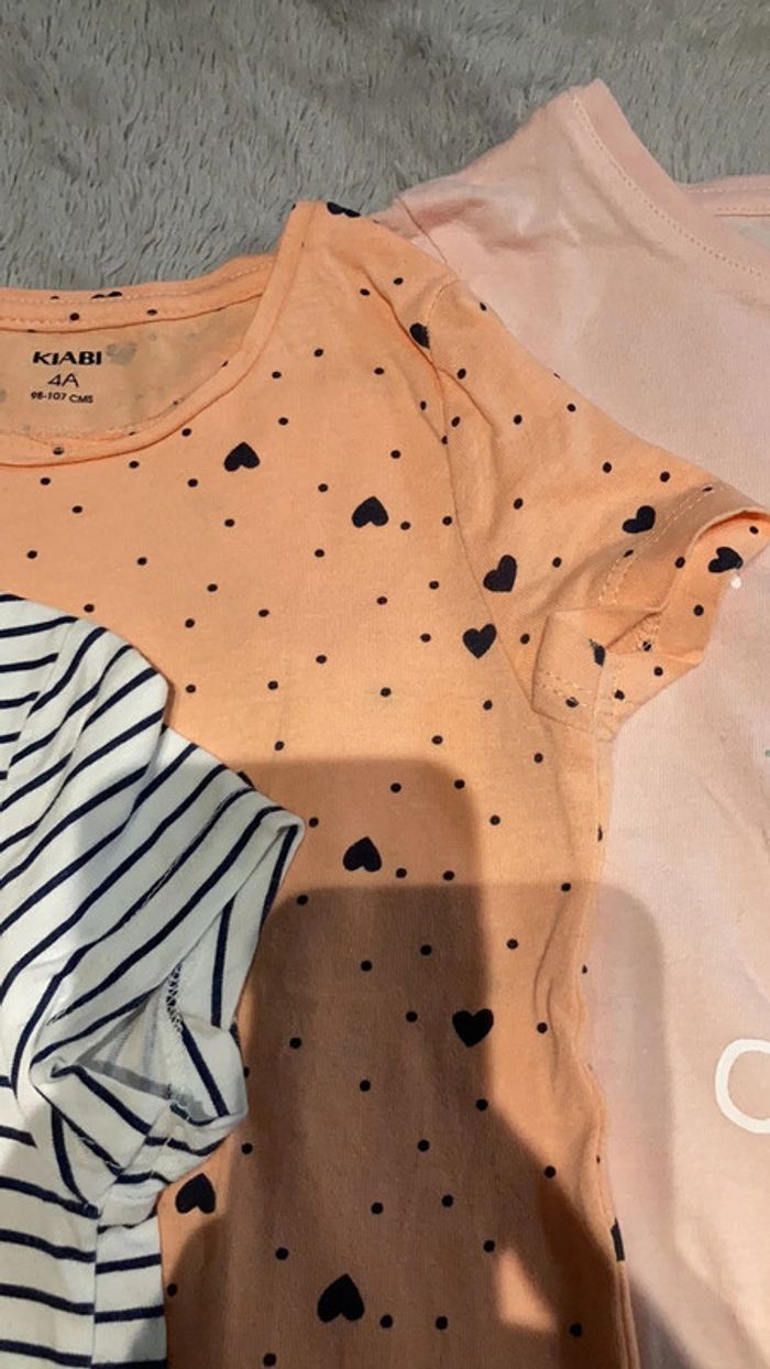 Trois T-shirts fille en taille 4 ans. Un T-shirt rayé marinière avec un cœur rouge. Un T-shirt abricot avec des cœurs noirs et un T-shirt rose avec Marie des Aristochats