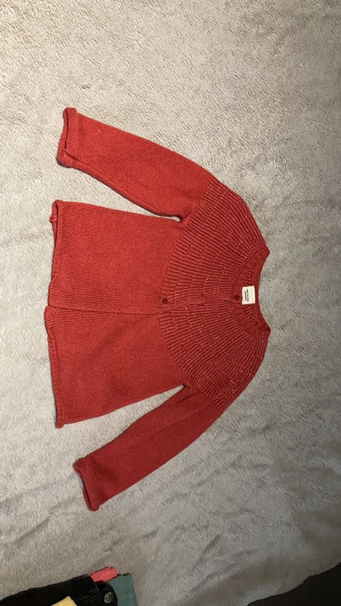 Joli petit gilet fille, en couleur rouge, brique avec liseré brillant. En très bon état en taille 36 mois.