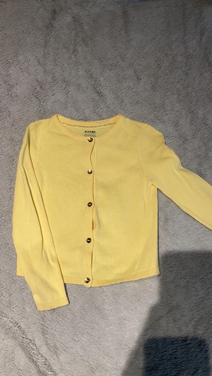 Joli petit gilet fille de couleur jaune avec des petits boutons dorés en très bon état en taille trois ans