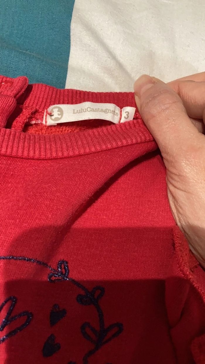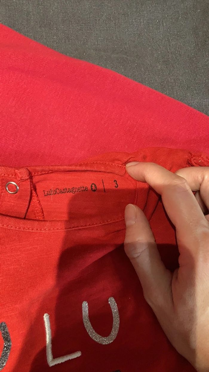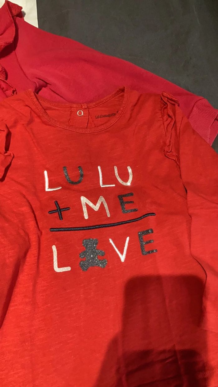 1 sweat shirt lulu castagnette rose fushia ainsi qu’un tee shirt manches longues rouge lulu castagnette. En taille 3 ans en bon état. Possibilité d’achat à l’unité