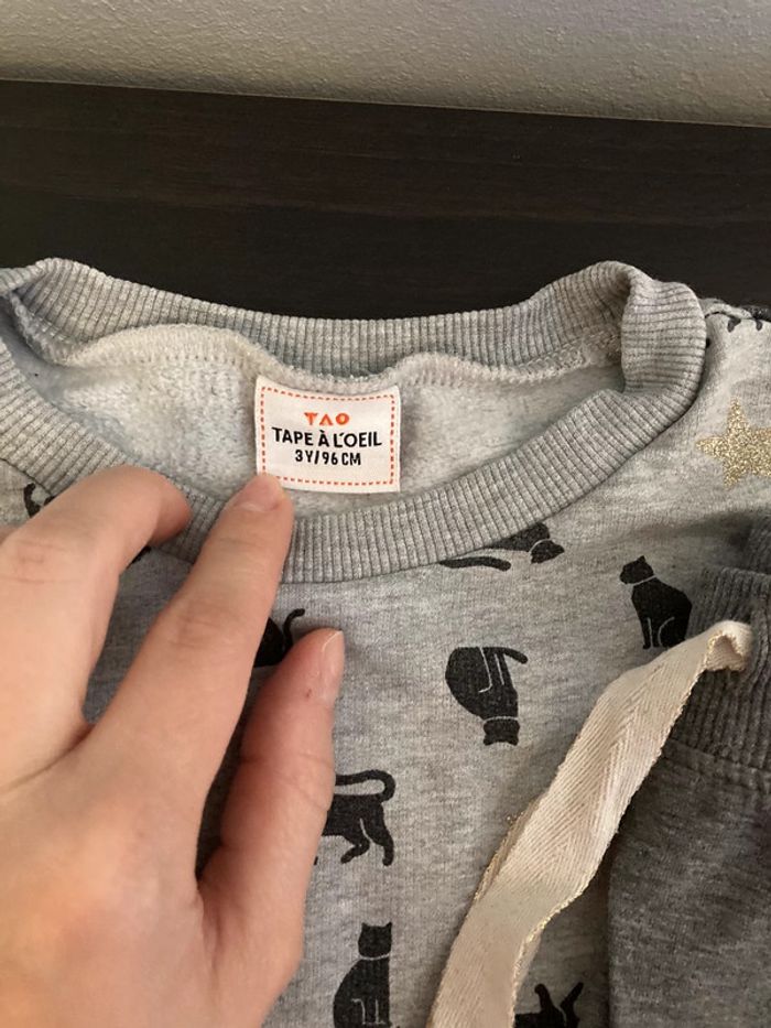 pyjama fille motifs chats, haut un peu molletonné et bas en coton resserré à la cheville. Acheté chez tape à l’œil en 3ans. Bon état général