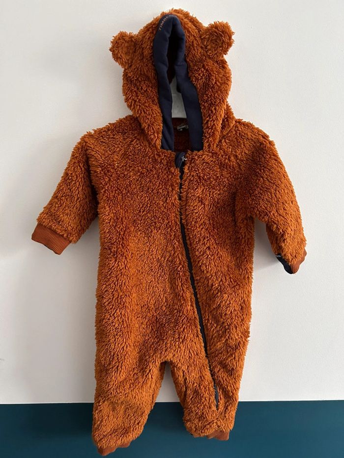 Combinaison polaire à capuche ornée d’oreilles. Ses moufles et pieds sont réversibles et confectionnés en molleton gratté de coton issu de l'agriculture biologique. Un zip en biais sur le devant facilite l'enfilage. Porté une seule fois- en parfait état.
