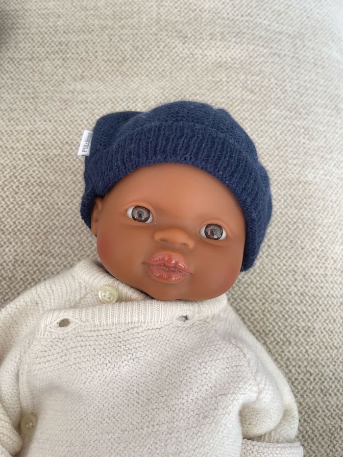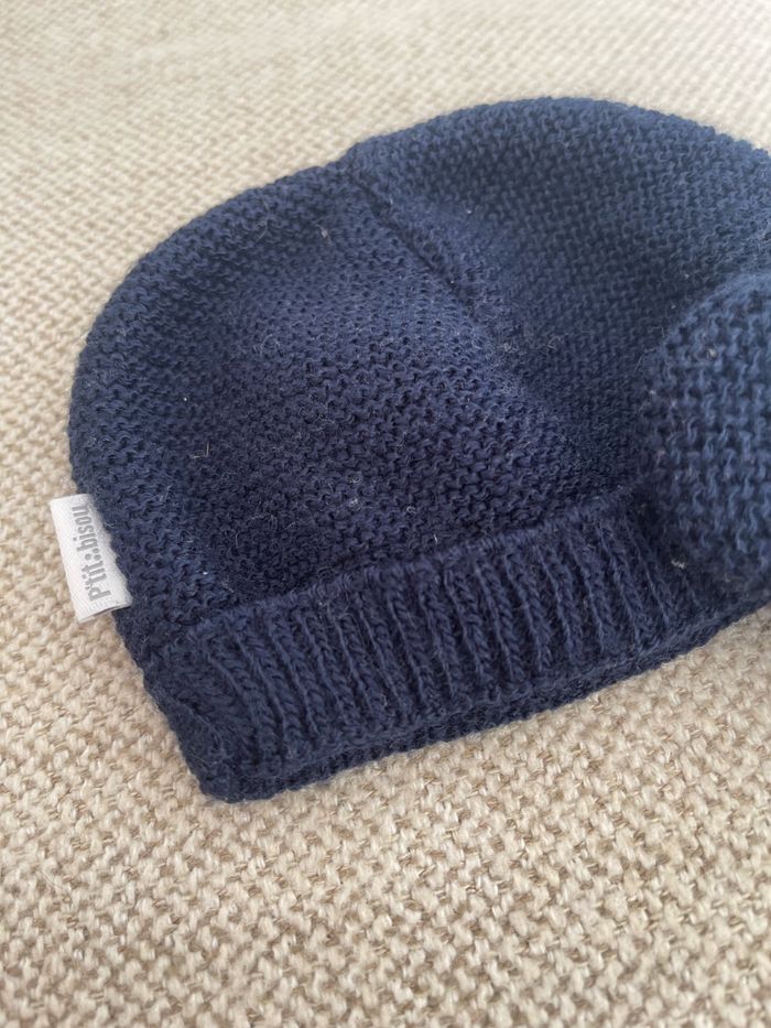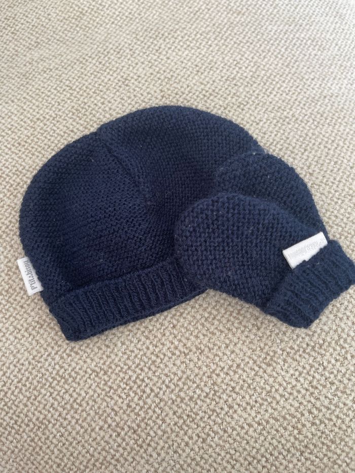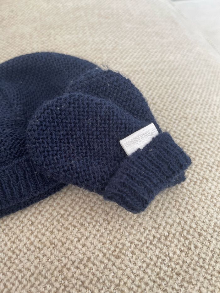 Bonnet et gants en laine tricotée Marque P’tit bisou Bleu marine Taille Naissance #bonnetbebe #gantsbebe #bonnetetgantsbebe #bebegarcon #bebefille #bebemarine