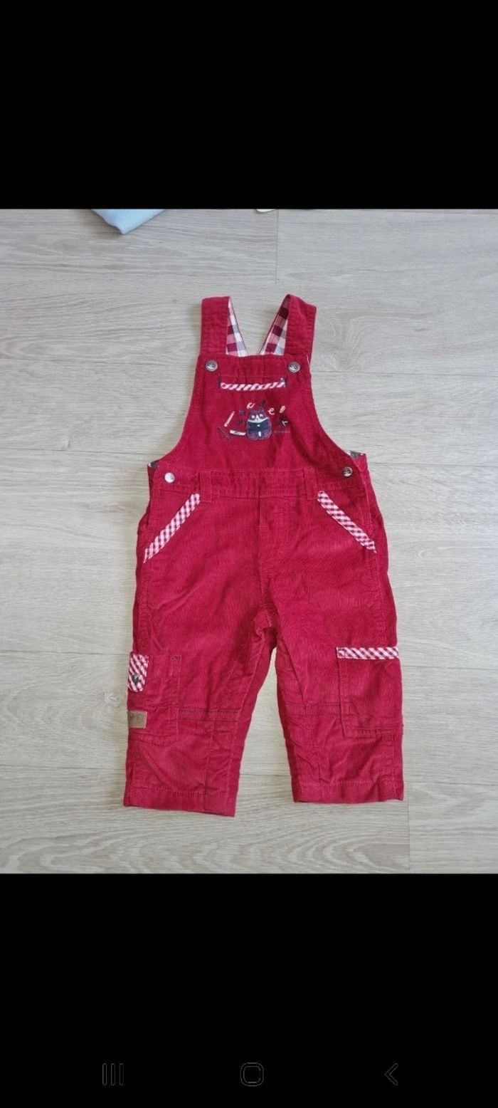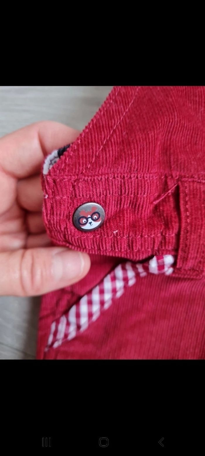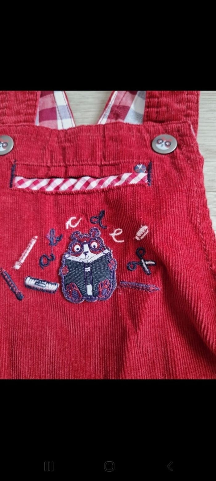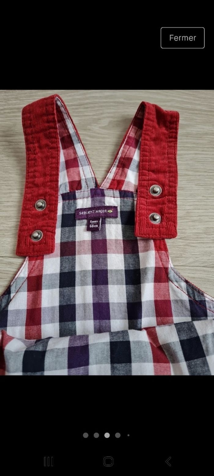 Salopette en velours finement côtelé rouge avec liserés à carreaux rouges et blancs. Patch et broderies sur le devant, détails boutons. Peut être mixte 2 positions possibles pour bretelles, entre-jambes pressionné. Marque Sergent Major 6 mois. Neuve. Tous mes articles sont lavés avant la vente