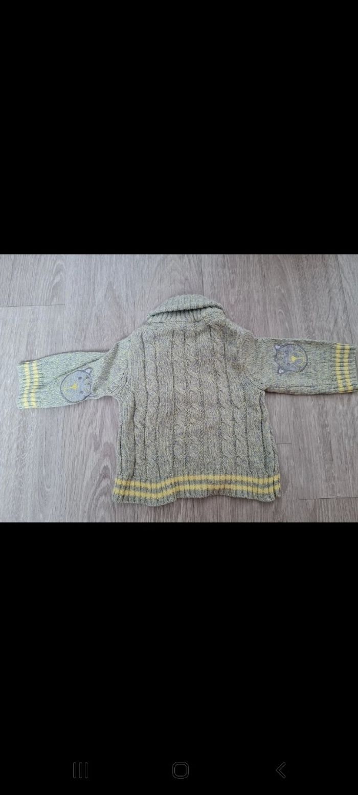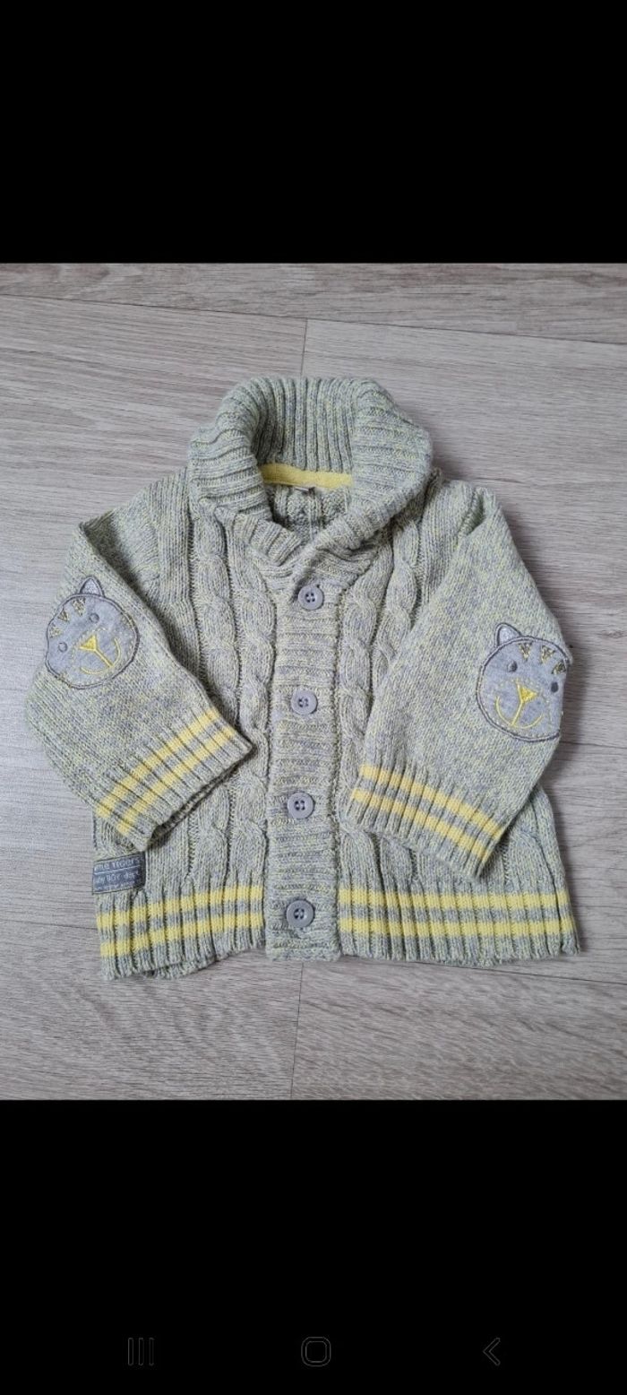 Gilet en maille boutonné Orchestra taille 1 mois. Vert chiné jaune, liserés jaunes, pièces tête de chat sur coude, détail torsades sur tricot, col montant. Neuf. Tous mes articles sont lavés avant la vente. J'ai beaucoup d'articles donc n'hésitez pas à me demander 🙂