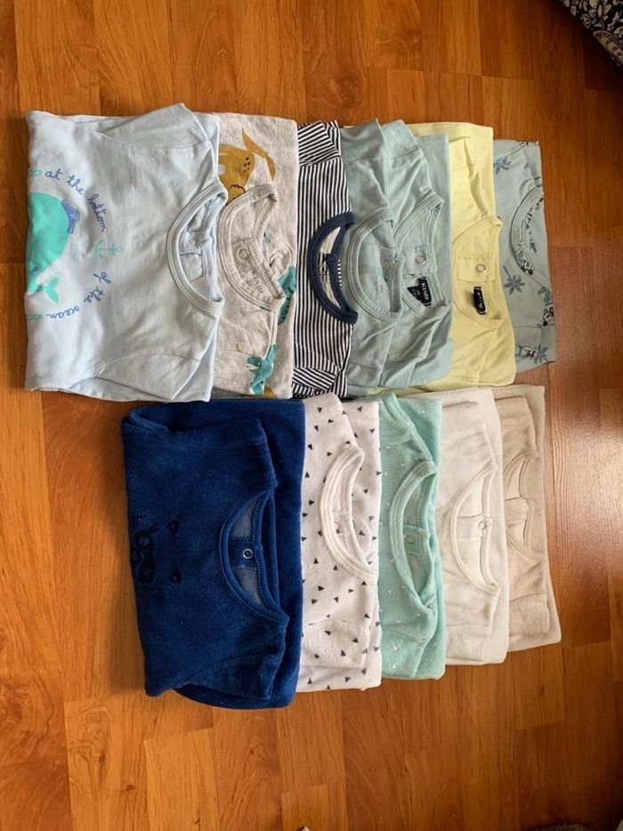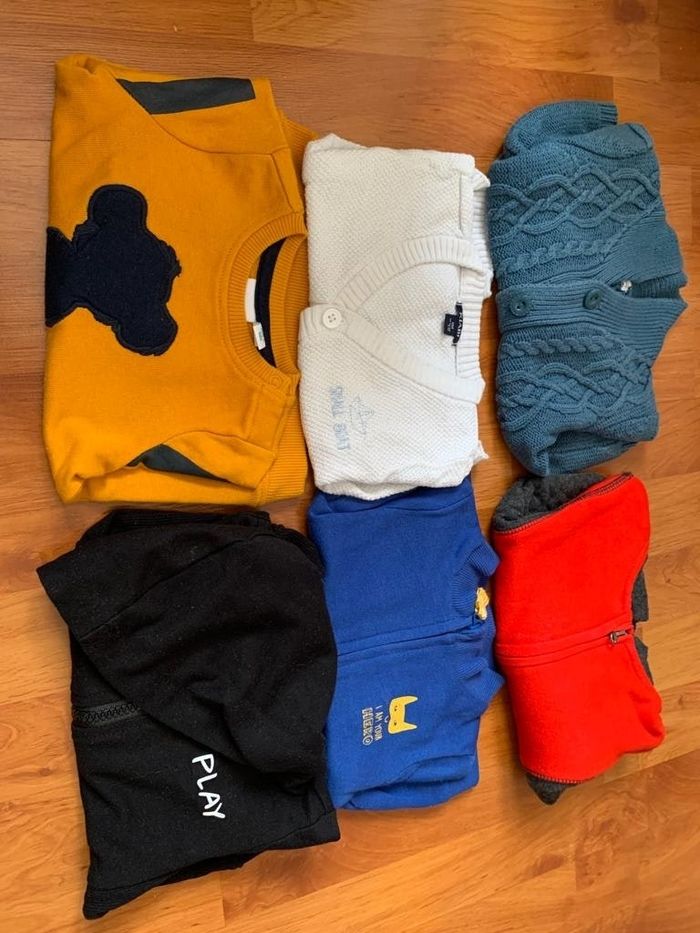3 hauts manche courte 6 hauts manche longue 2 chemises le lots 15 € 12 pyjamas 15€ 7 bodys manche courte 8 bodys manche longue le lots 15€ 2 jeans 4 joggings 3 pantalons fin le lots 20 € 2 gilets 2 vestes à capuche 1 veste 1 pull le lots 20€ Combinaison d'hiver 15€