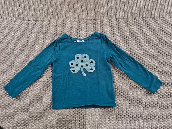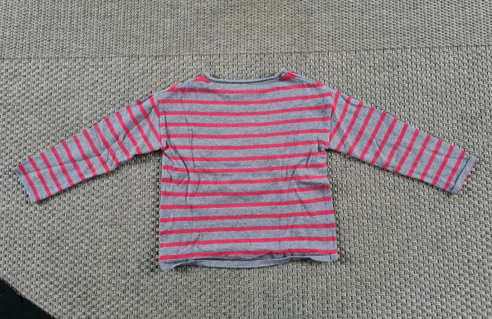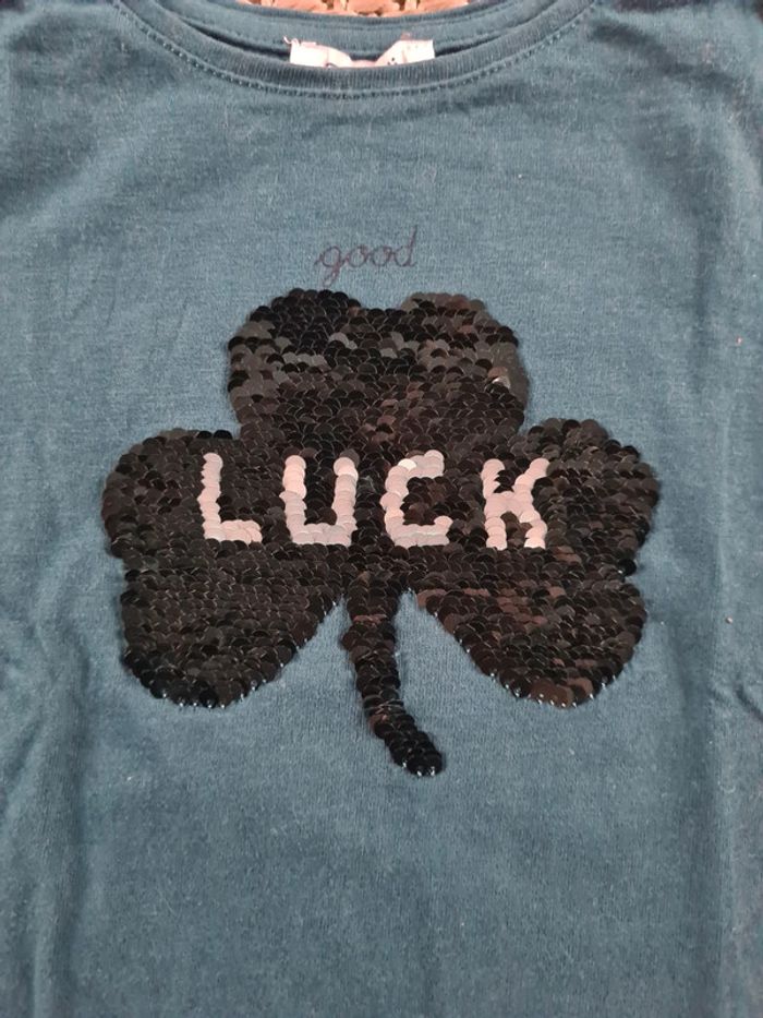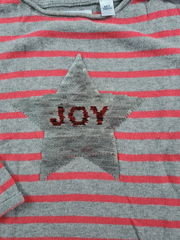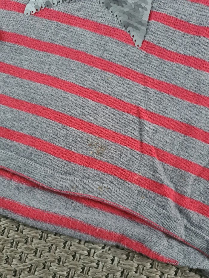 Lot fille : - pull fin rayé rose et gris motifs à sequins réversibles "coeur joy". En bon état. Une petite tâche peu visible (voir photo). Taille 4 ans - marque okaïdi - tshirt manches longues vert avec motifs sequins réversibles "trèfle luck". Très bon état. Taille 4 ans - marque okaïdi - Jean noir jamais porté. Neuf sans étiquette. Taille 4ans - marque Lisa rose. Étiquettes noms que je n'arrive pas à retirer. #choupihelofille4ans