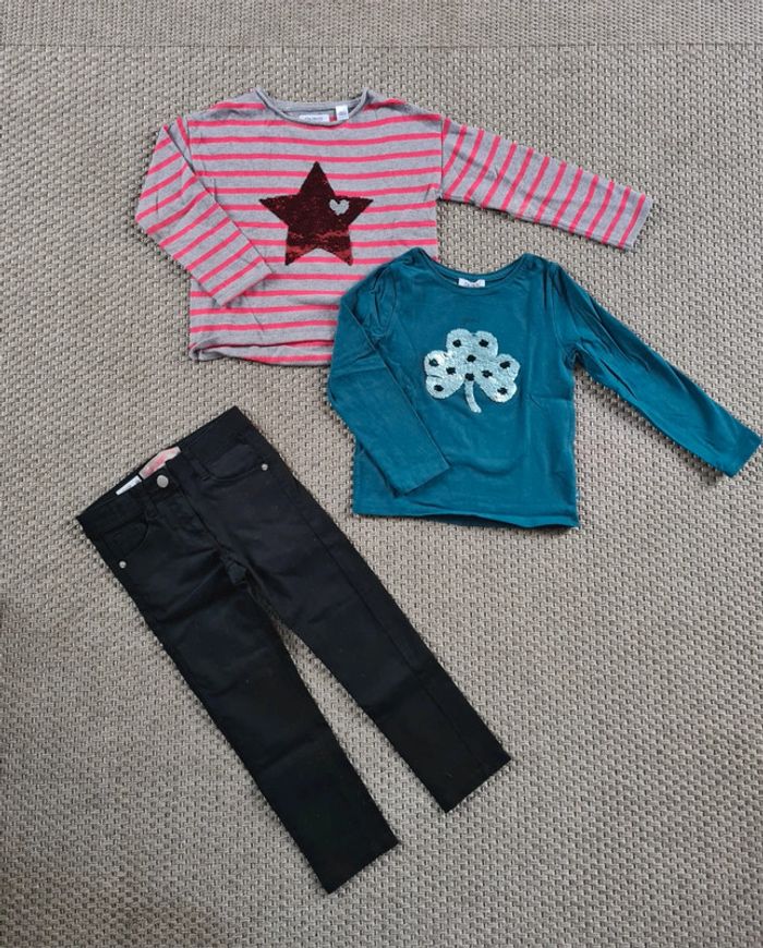 Lot fille pull, t-shirt sequins réversibles et 1 jean noir - 4ans - photo numéro 1