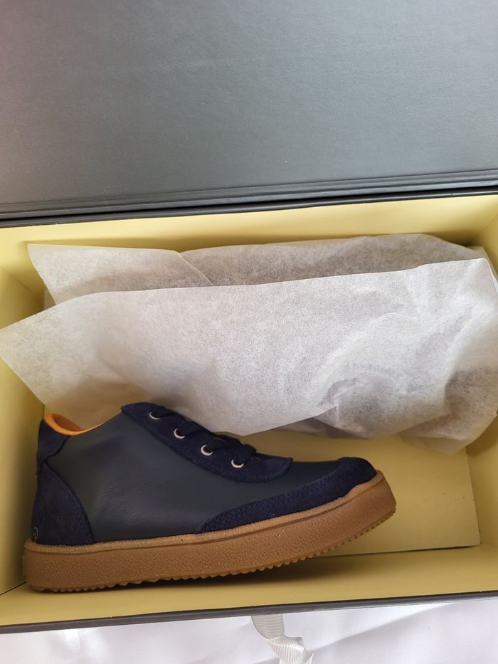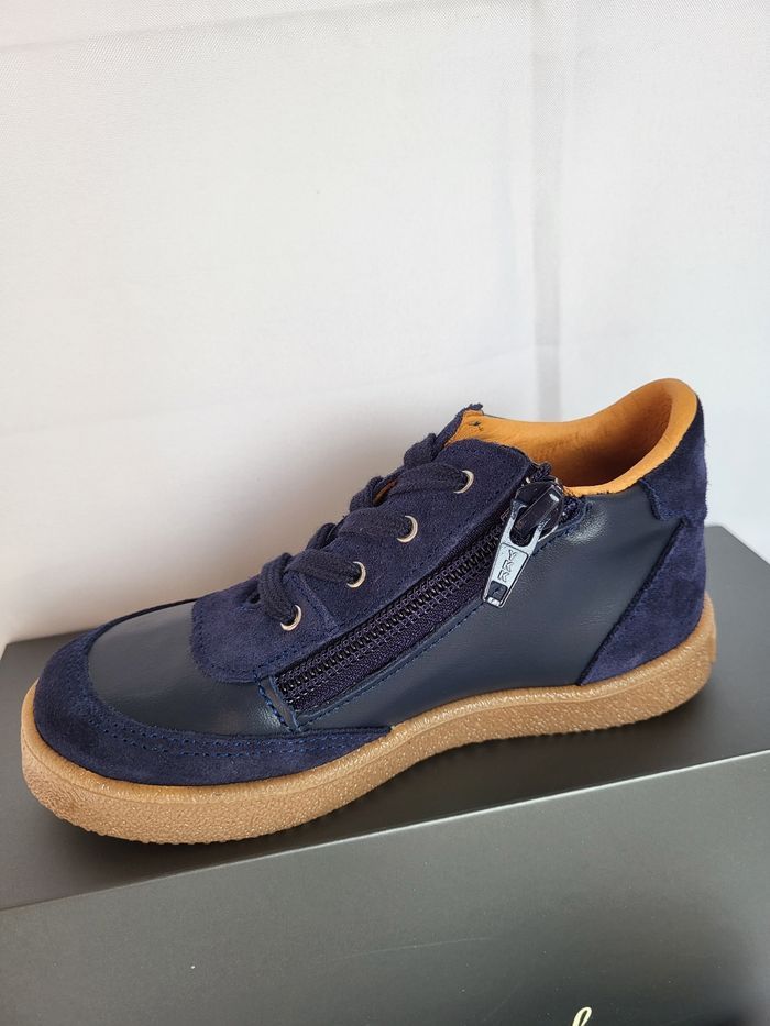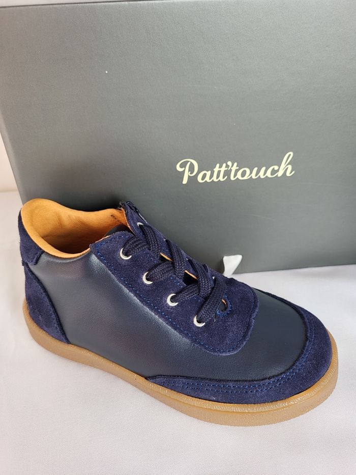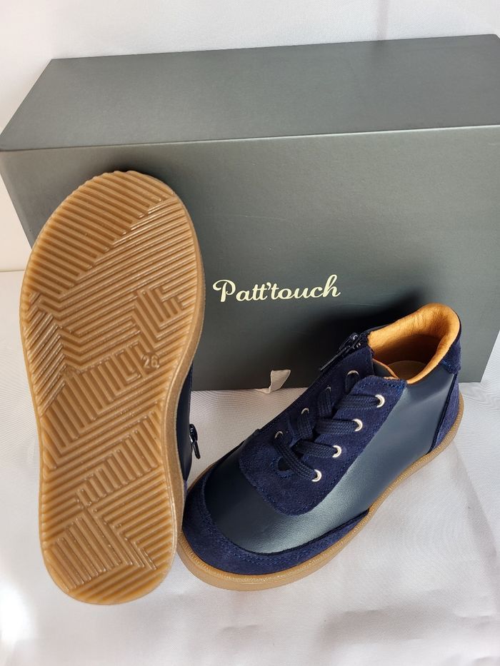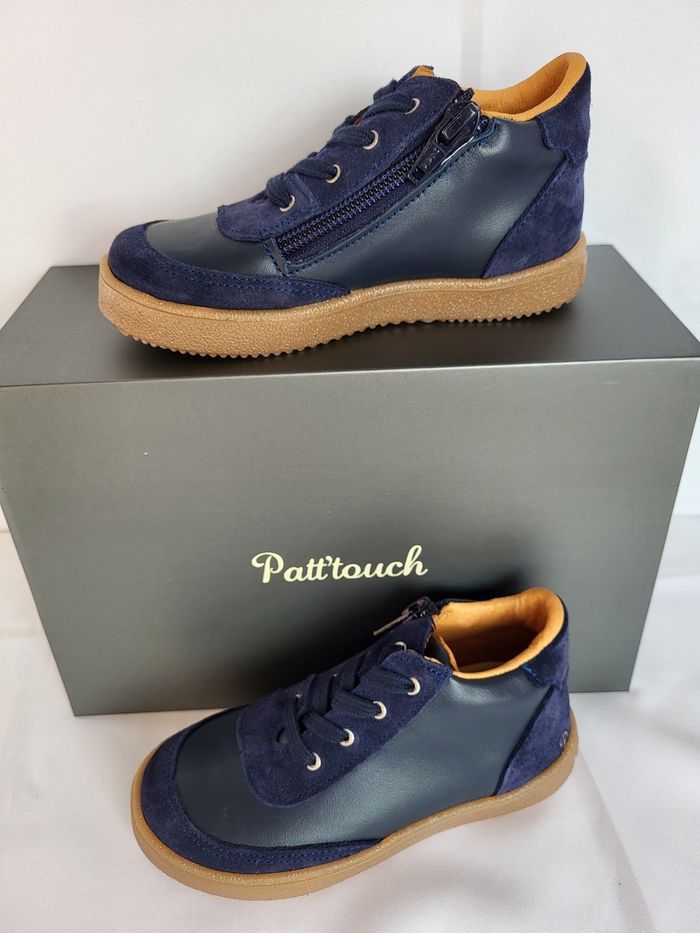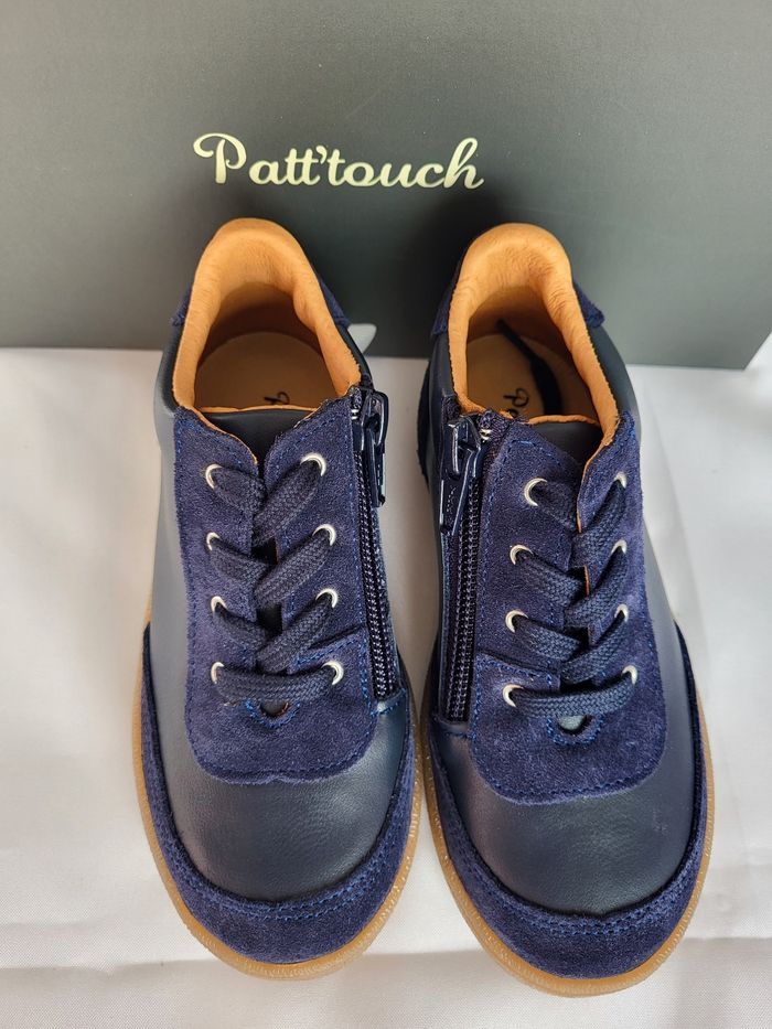 Chaussures enfants de très belle qualité, de la marque PATT'TOUCH Dessus tout en cuir lisse souple et croûte velours marine, doublure et semelle intérieure en cuir beige, semelle extérieure en caoutchouc, souple et légère. Fermeture lacets et zip Fabrication 100% Française Dimensions de la semelle intérieure : longueur 17.1 cm largeur 5.9 cm Emballage en coffret gris avec ruban écru au nom de la marque Déstockage à petit prix, idéal pour offrir ou se faire plaisir ! Neuves, jamais portées Taillent normalement Envoi sous 24h