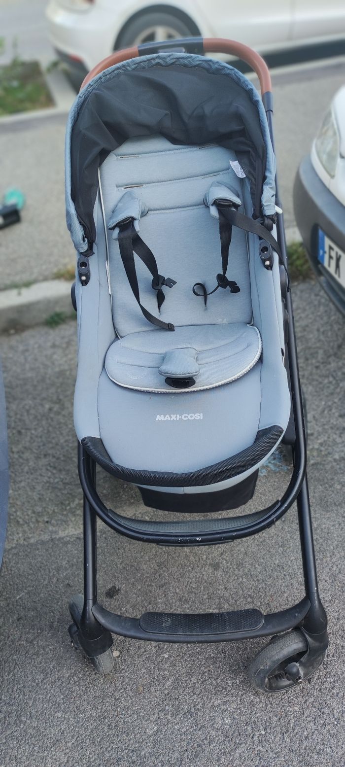 Poussette maxicosi Modèle Zelia Très bon état, vendue avec adaptateur pour plusieurs cosy et bâche de pluie. Moustiquaire intégrée. Siège inclinable. Très maniable, grosse roue Pour tout terrain. Couleur bleu/gris