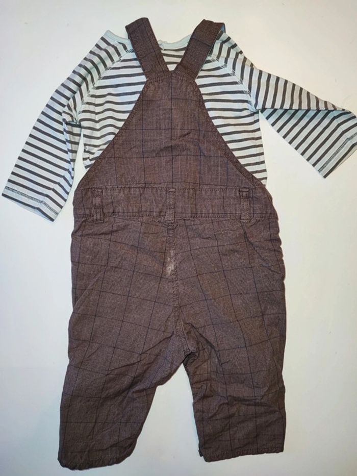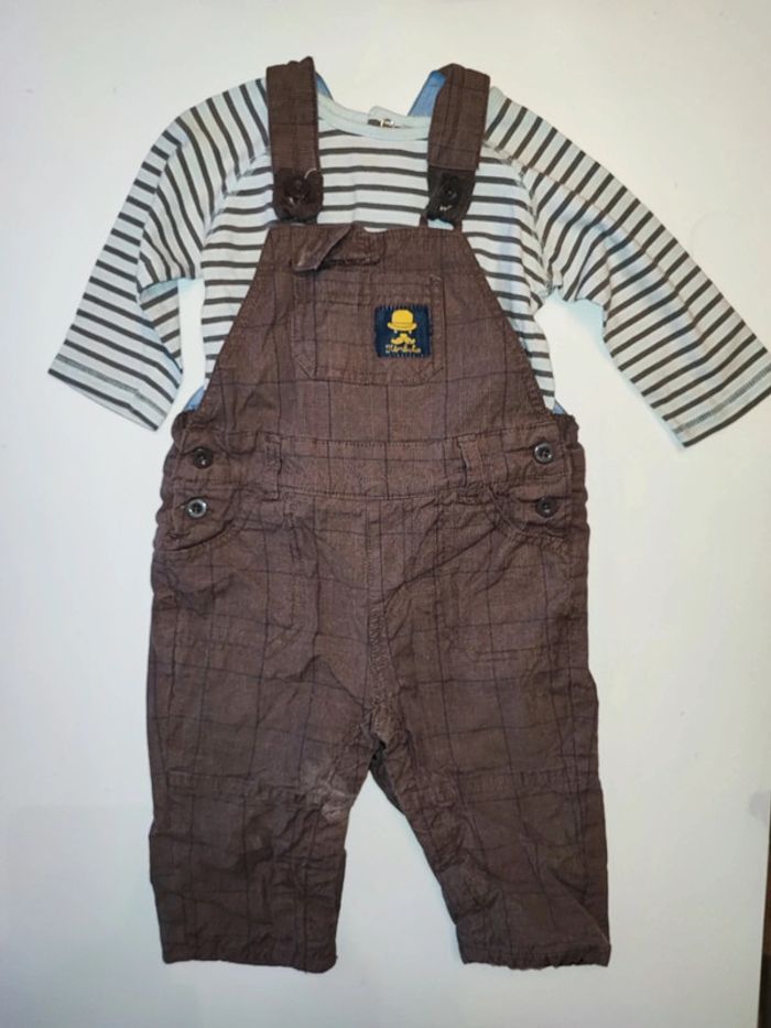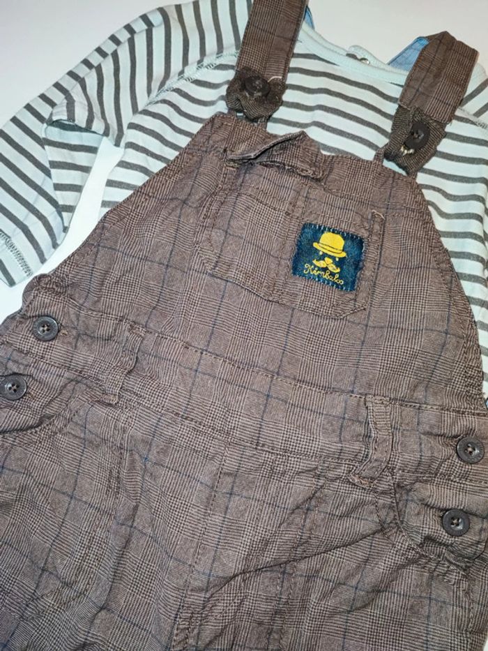 Ensemble composé d'une salopette marron et d'un tee shirt manches longues bleu clair et marron, taille 12 mois, marque Naturalys et Kimbaloo. #ledressdejena_12mois