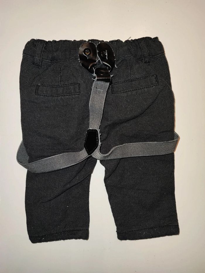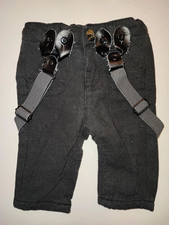 Pantalon gris foncé avec bretelles amovibles, taille 3 mois, marque Kiabi. Taille ajustable avec élastique et boutons. #ledressdejena_3mois