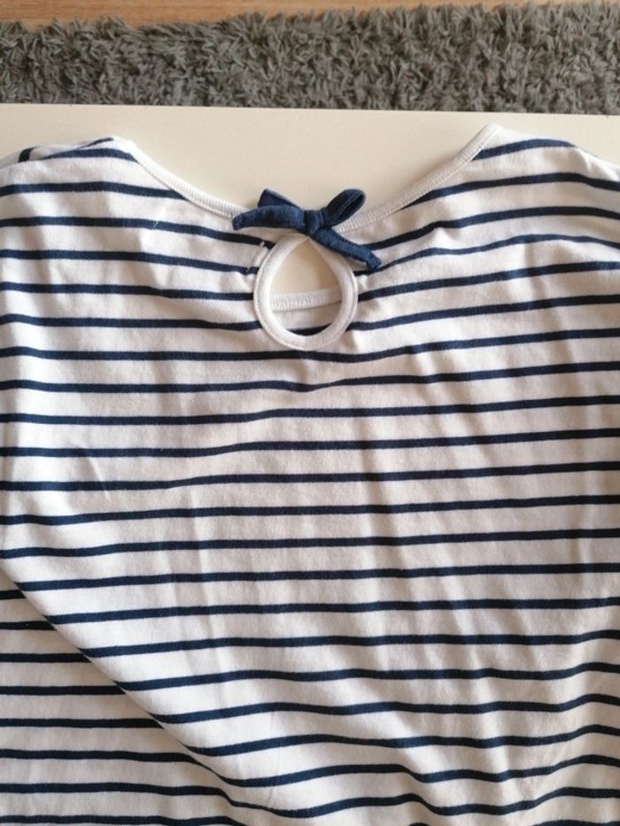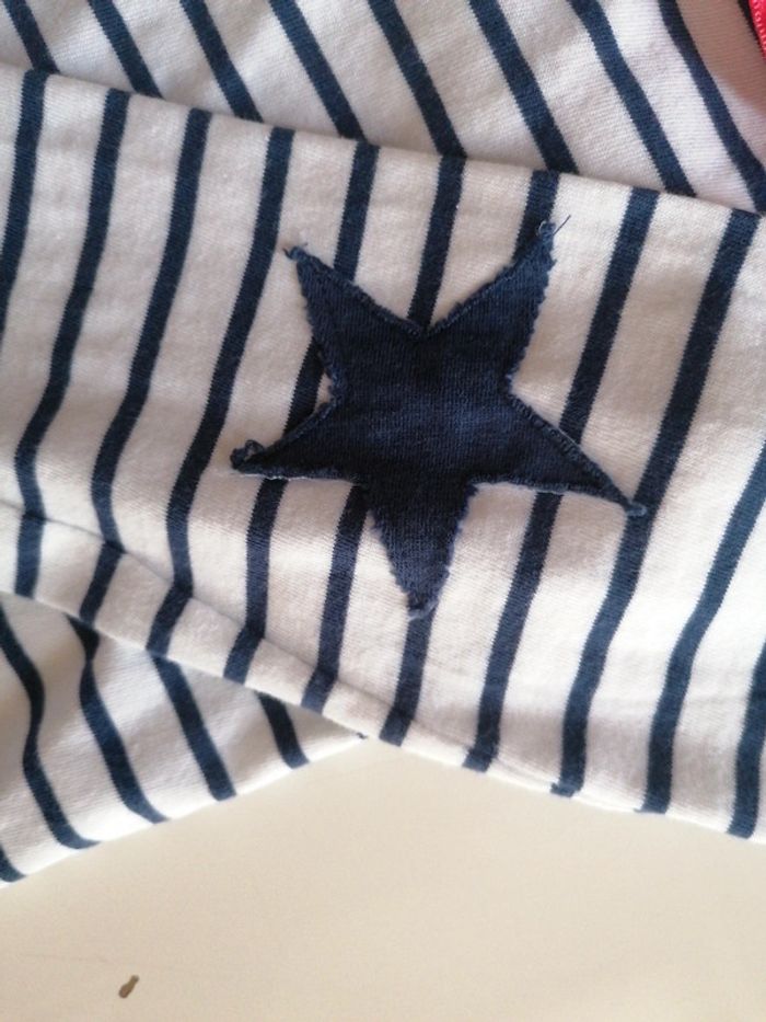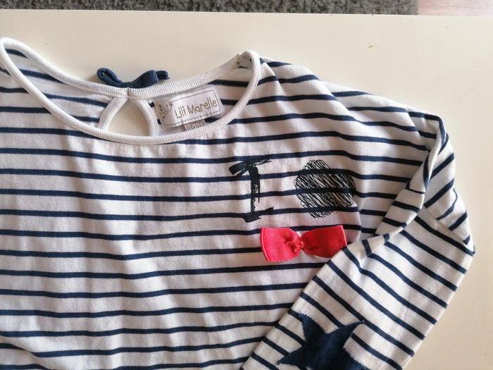 T-shirt marinière manches longues, de marque lili marelle, couleur bleu marine et blanc, taille 10 ans, en très bon état, porté 2 fois