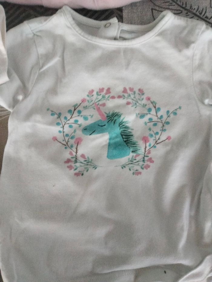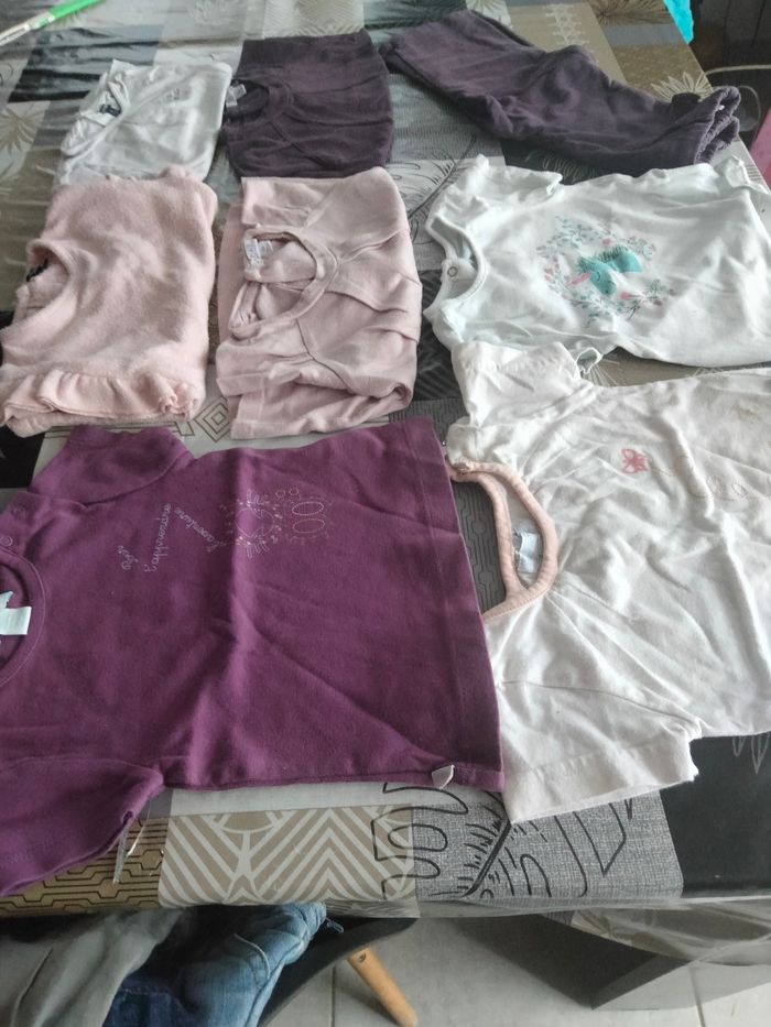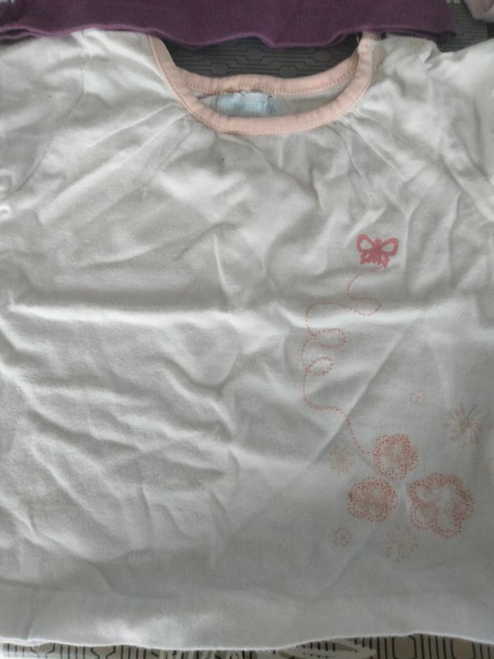 Lot 9 mois Un pull rose 6 mois mais qui taille 9 3 t-shirts 12 mois 1 pantalon et 3 polos 9 mois Blanc un peu grisonant mais pas de tâches ni trou
