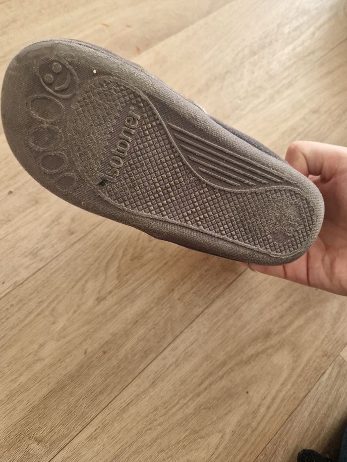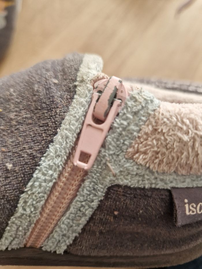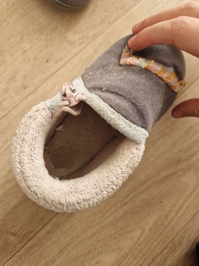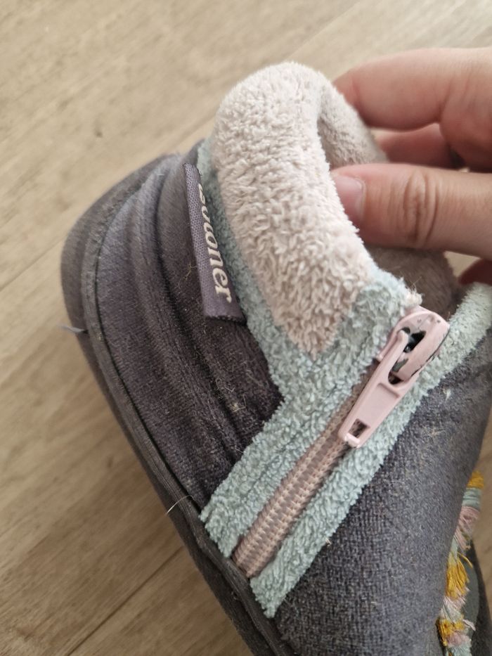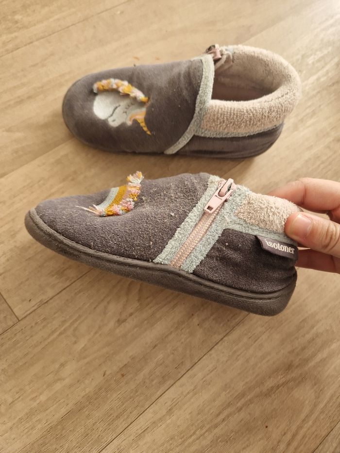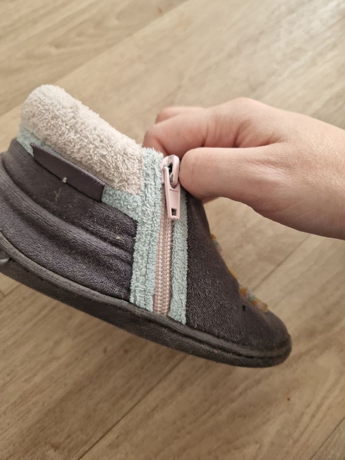 Chaussons dépareillés licorne. Matière toute douce. Lavable en machine. Peinture légèrement écaillée sur la fermeture