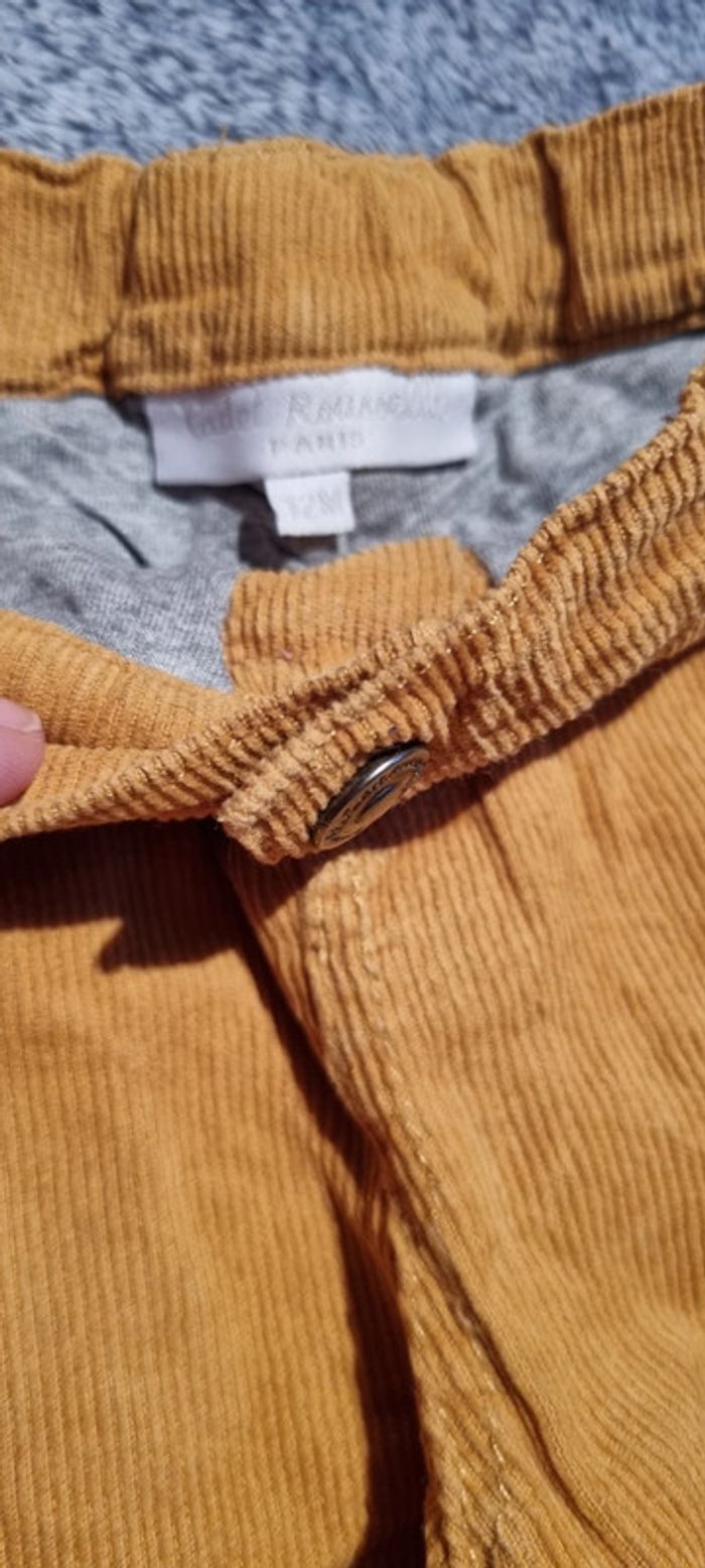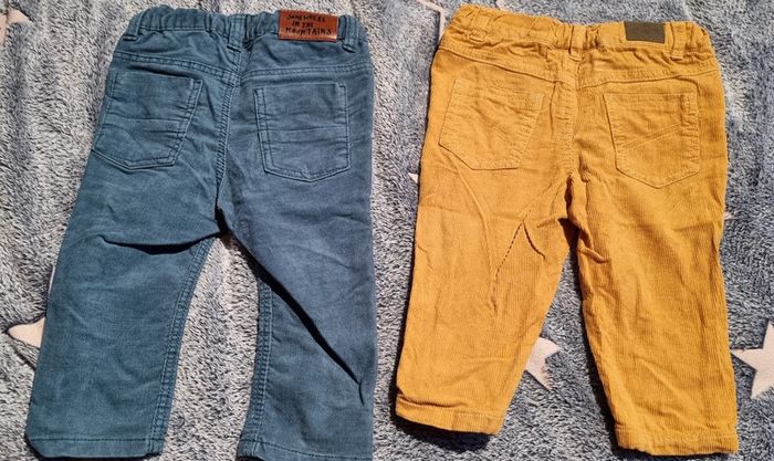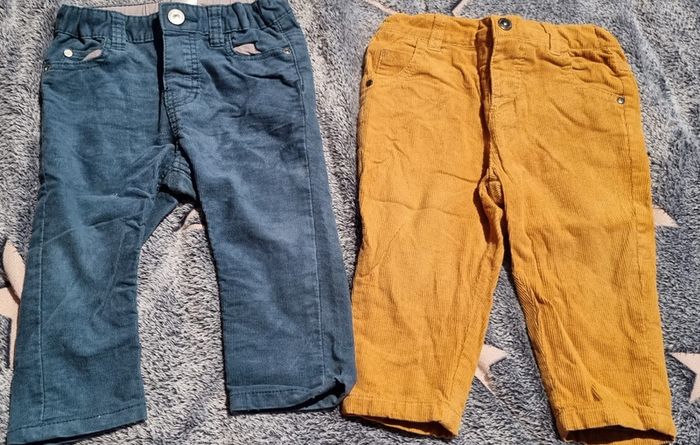2 pantalons velours moutarde et vert foncé pour l'hiver! En très bon état! H et M (noté 6-9 mois mais 74 cm) et cadet rouselle 12mois. #12mois#bébé