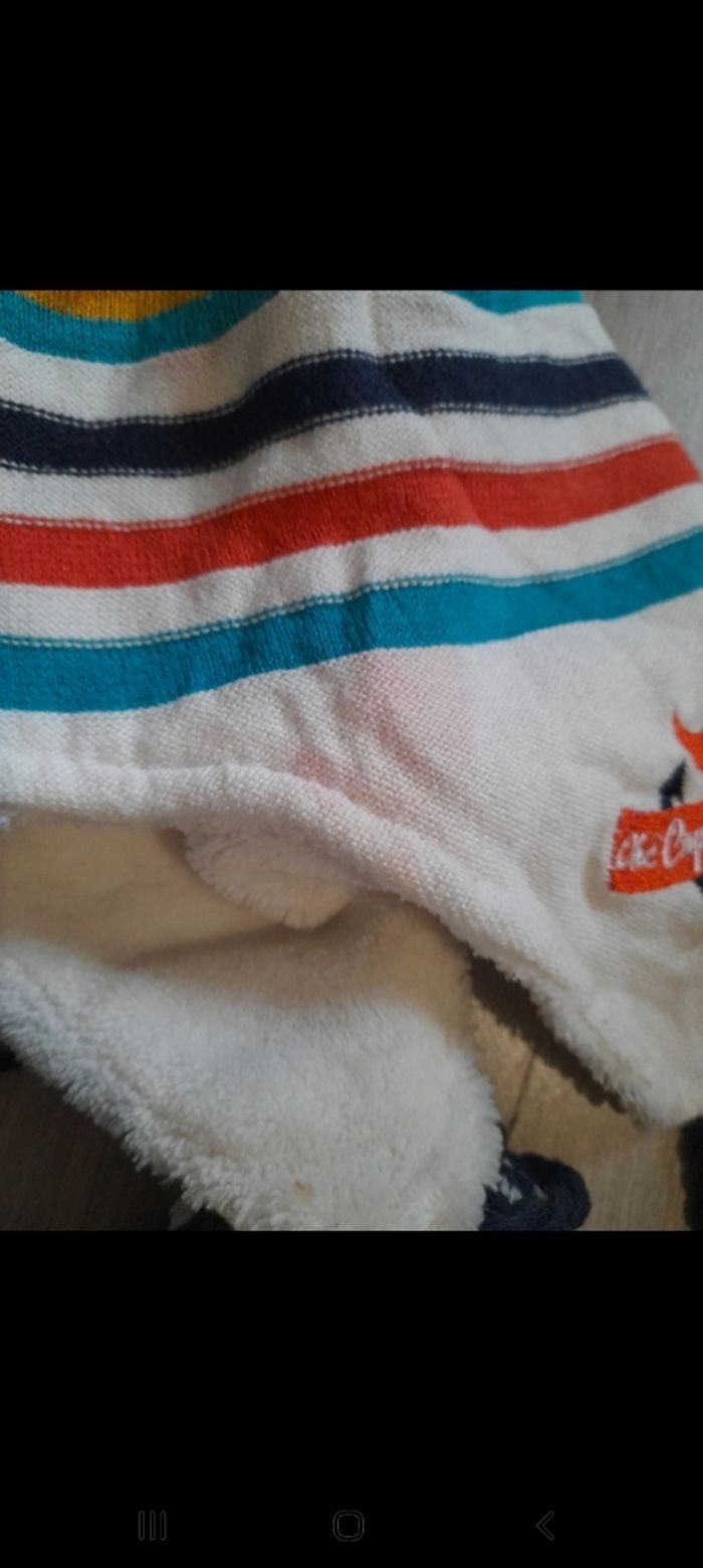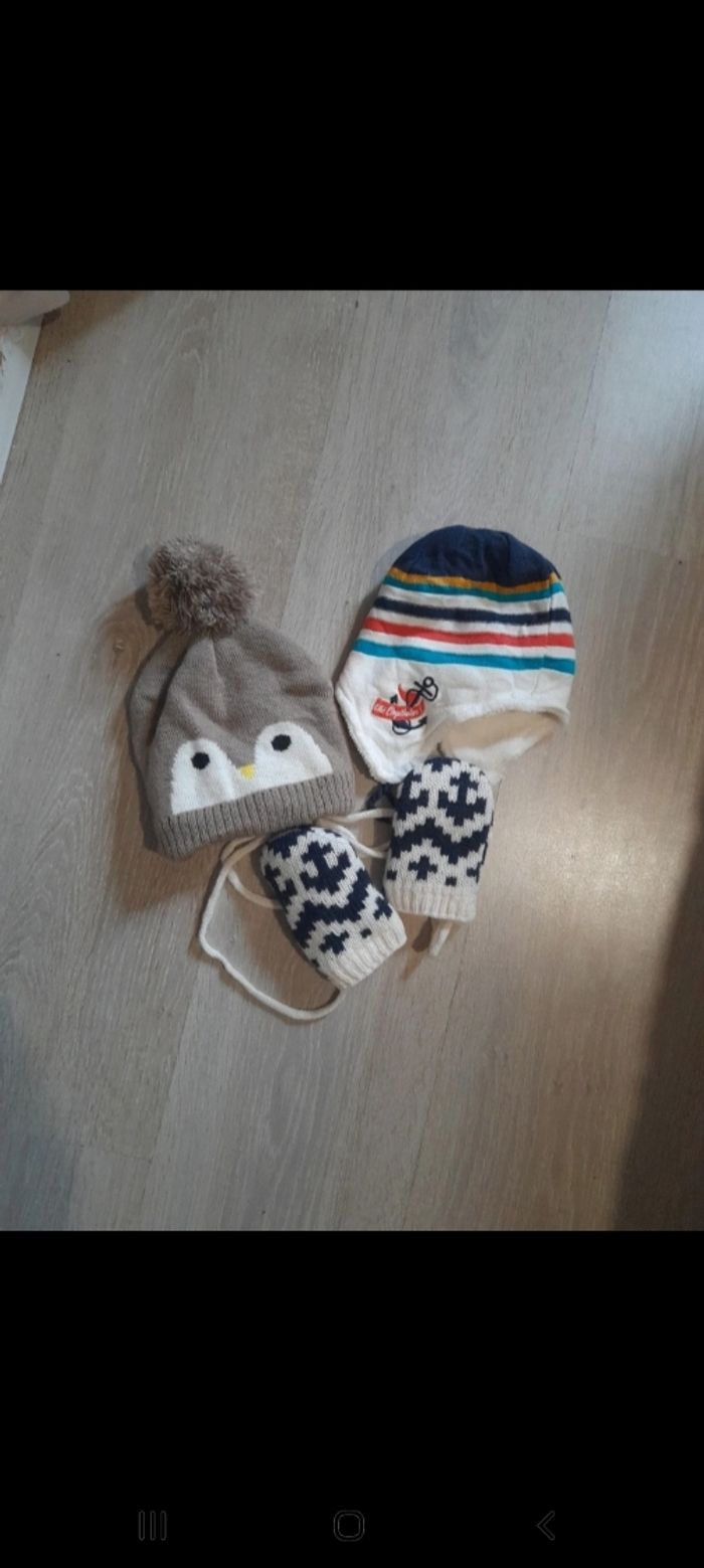 2 bonnets et une paire de moufles Petite tâche voir photo sur le bonnet marinière