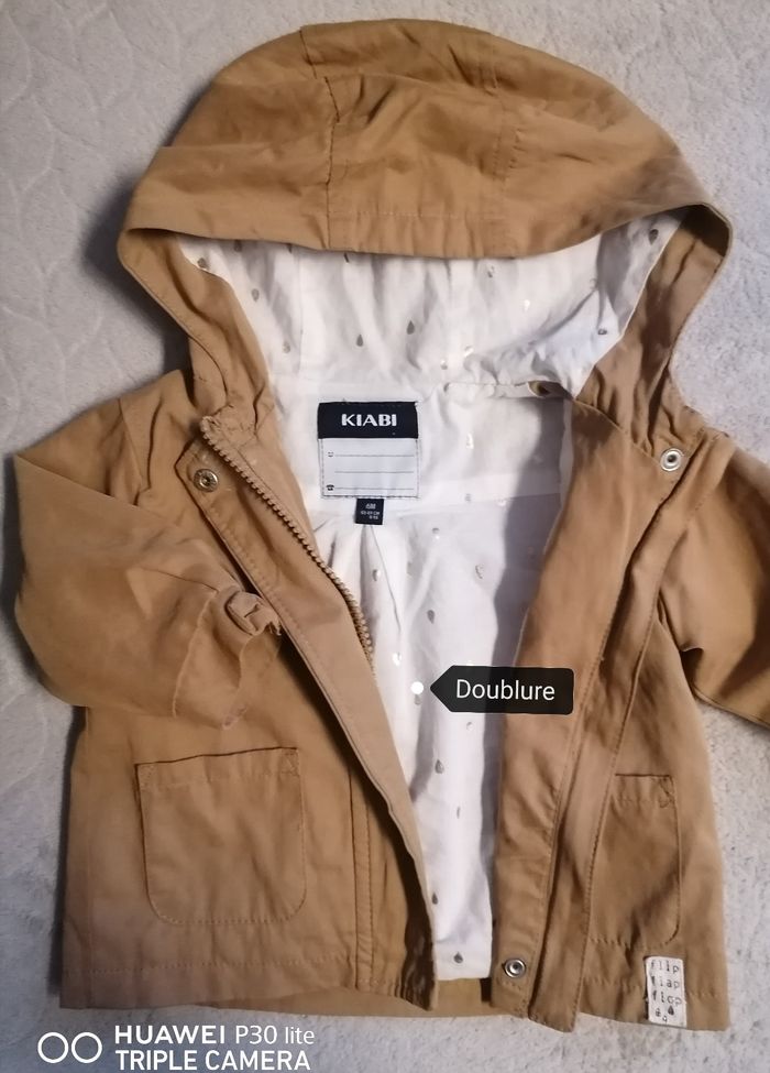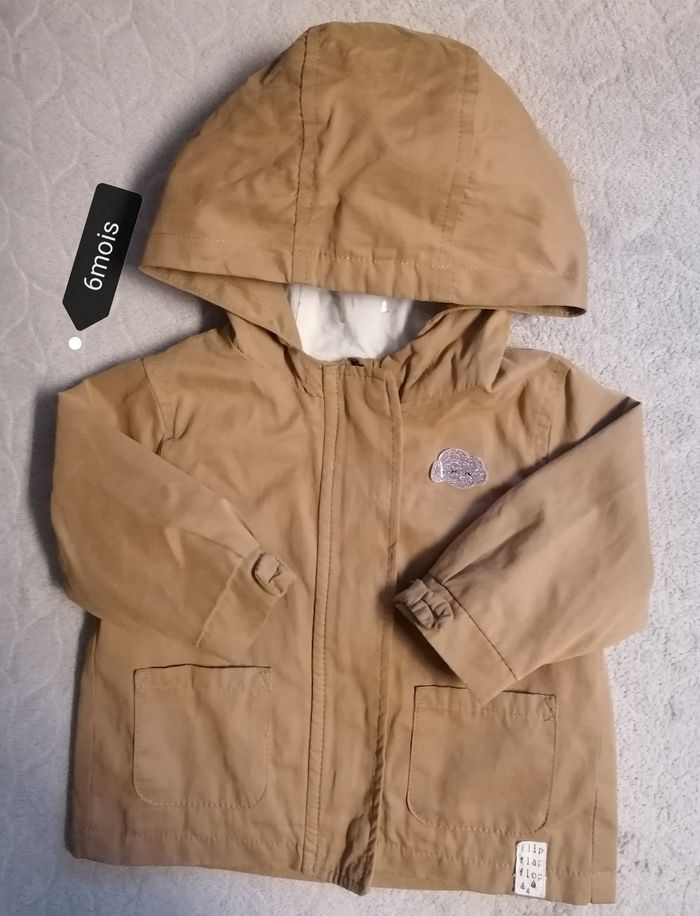 Veste bébé filles Marque kiabi Age 6mois ( 63/69cm) Couleur beige 56% polyester. 33 %coton Une doublure Fermeture zippée 2 poches sur les côtés Capuche intégré, manche longue Portée une a 2 fois. 5€