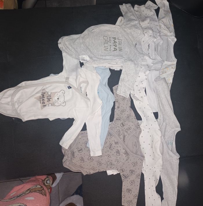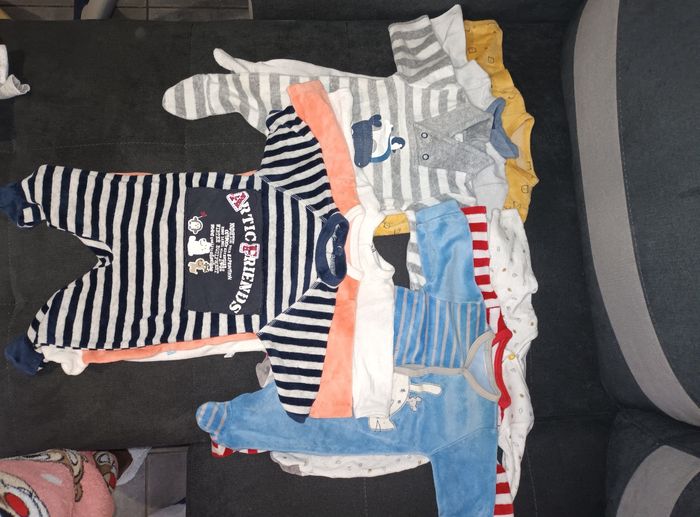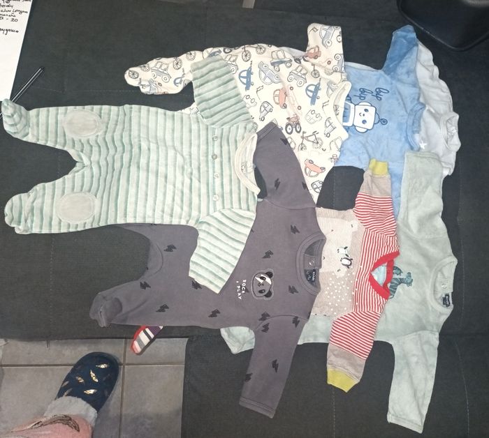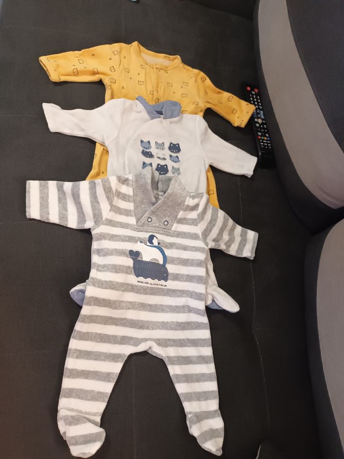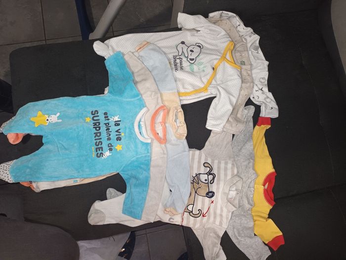Lot de pyjama et body 1 mois et 3 mois, plus combinaison de 1 mois à 3 mois turbulette offerte. Idéal pour compléter la layette. Livraison en remise en main propre