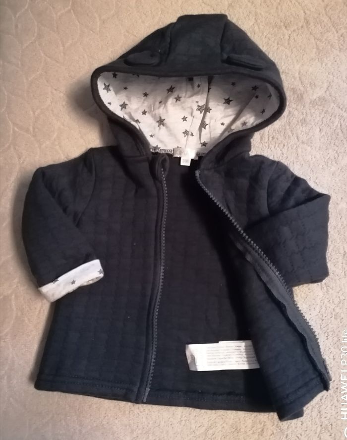 Veste avec capuche intégré Marque Kimadi Age 3mois Couleur bleu marine Matière 72%coton. 28%polyester. Doublure capuche 100 %coton. Fermeture devant zippée Portée 2fois 4€