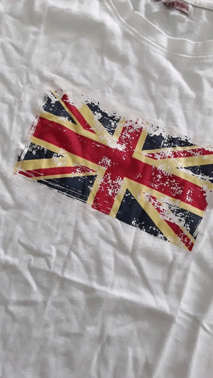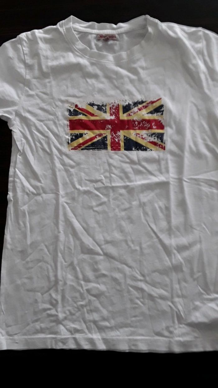 T shirt blanc manches courtes avec le drapeau du royaume uni Taille 14 ans Marque U essentiel Très bon état #londres #blanc #tshirt #14ans