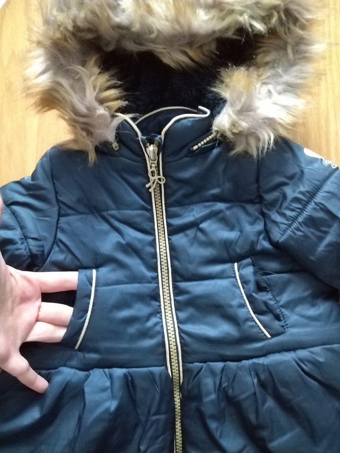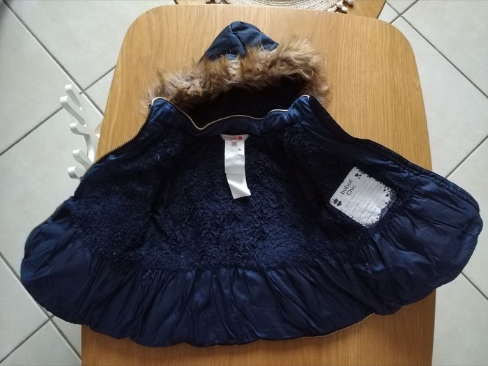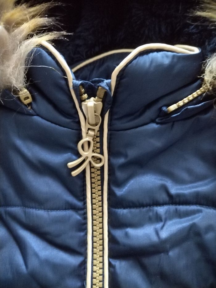 Doudoune bleu marine et Or Boboli Extérieur matière déperlante, intérieur fourré en fausse fourrure. Capuche amovible avec fausse fourrure. 2 poches sur l'avant. Fermeture zippée. Parfait état Taille 18 mois soit 86 cm