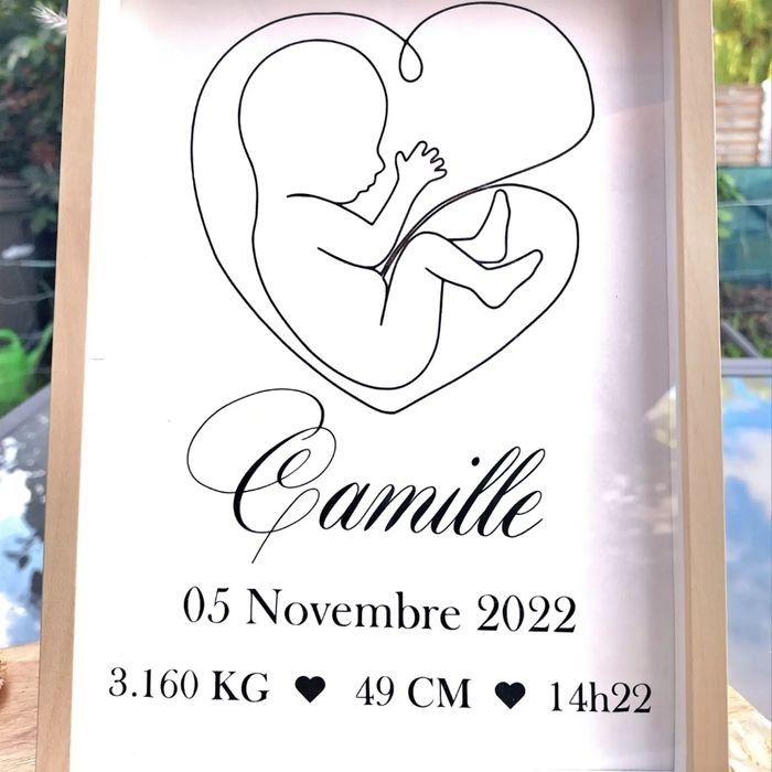 Cadre souvenir d'un moment indélébile de votre vie, un moment magique fixé à jamais. Avec prénom de bébé et information de Naissance de l'enfant. Un cadeau de Naissance très original qui plaira aux parents et une jolie décoration dans la chambre de Bébé. Moderne et minimaliste souvenir d'un moment précieux dans le temps.