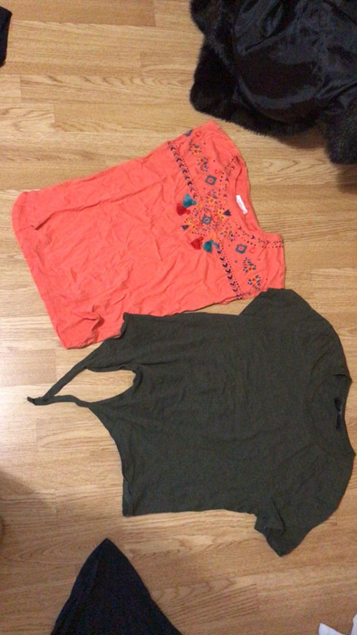 Lot 2 t-shirt kaki Tally Weil a nouer manches courtes et orange corail sans manches à ponpon 10 ans