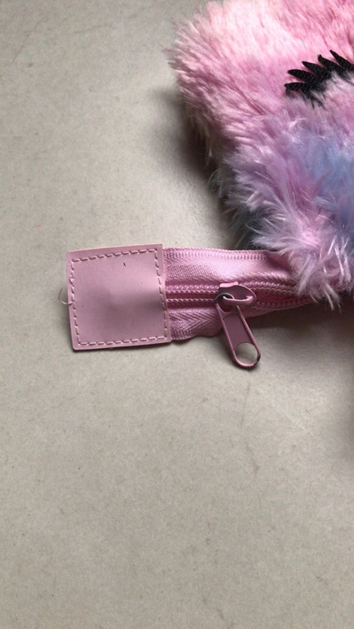 Trousse de toilette licorne multicolore avec fermeture à tirette, doublure intérieur synthétique, matière tissus peluches et oreiller et corne pailleté argenté 21x11
