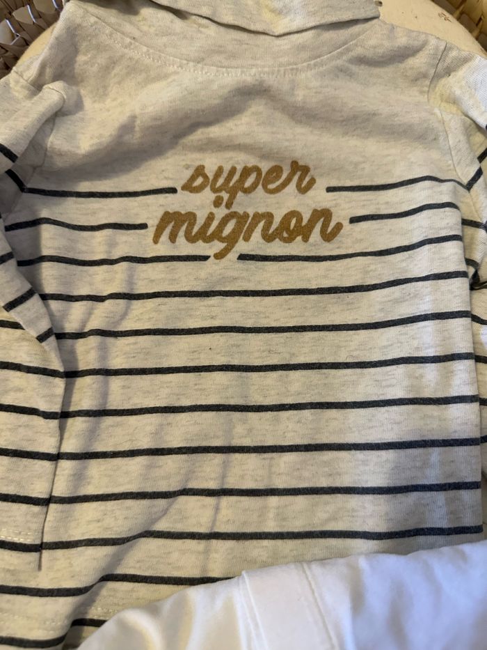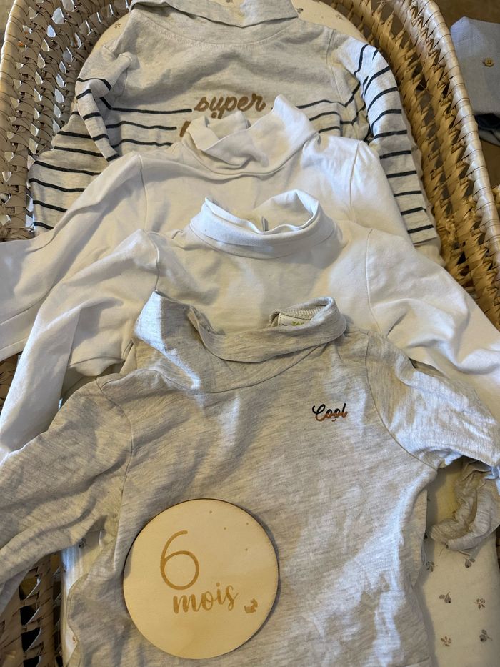 Lot de 4 sous pull 2 blanc uni kiabi 2 tape à l’œil Le super mignon est légèrement délavé Les autres en très bon état Taille 6 mois