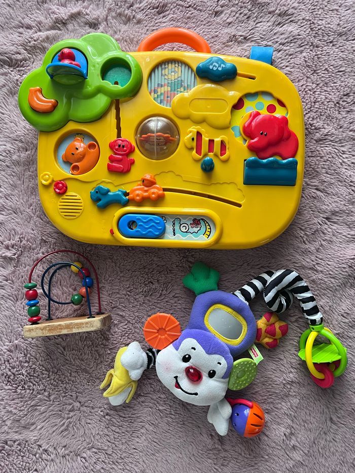 * table d activité Peut s accrocher. Jouet à piles mais ne fonctionne pas pour le son ( manque cache piles) Taille 40 cm/ 30cm * boulier ( quelques rayures sur le socle) * petit singe ( le son ne fonctionne pas mais à vérifier avec des piles )