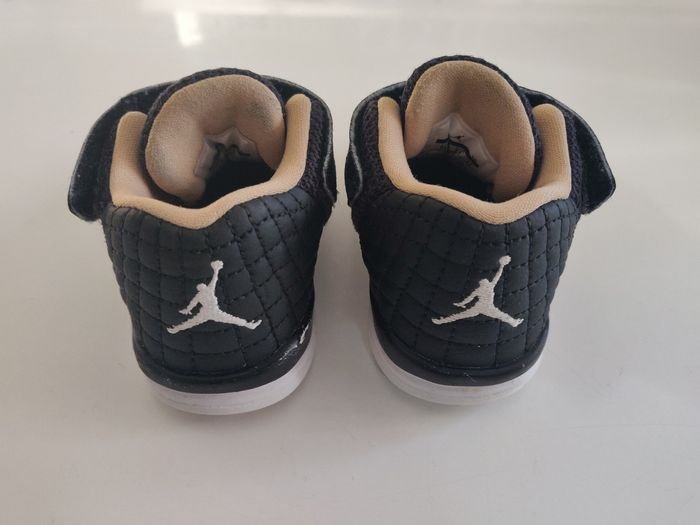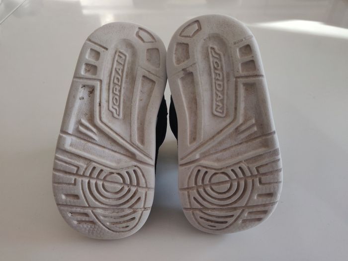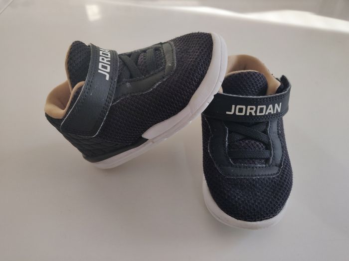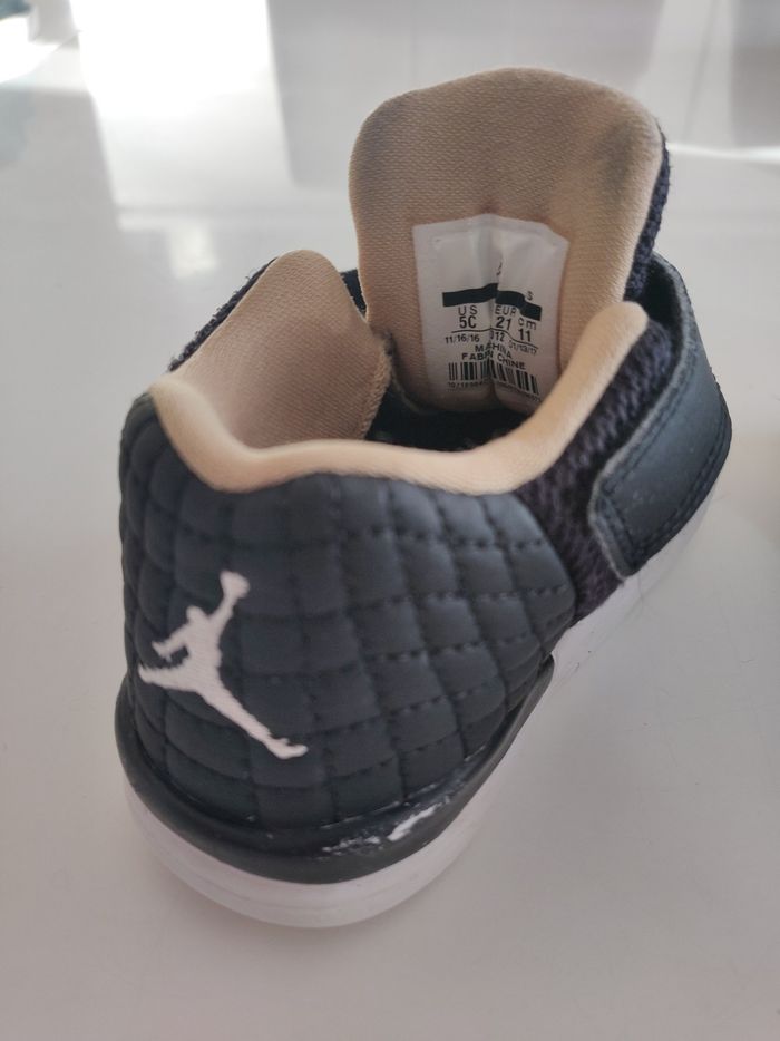 Basket Jordan taille 21,couleur mixte, légèrement taché sur l'arrière de la languette et quelques éraflures mais reste en très bon état pour une seconde vie.