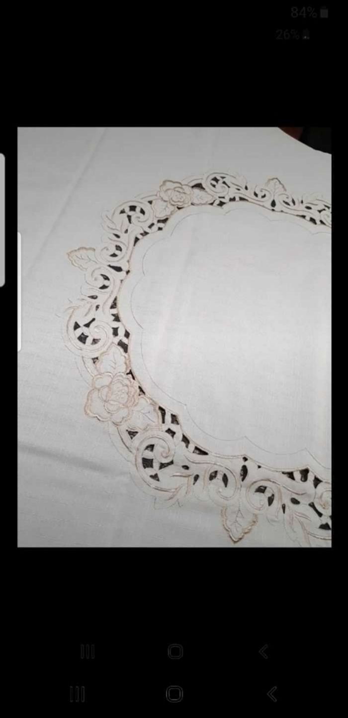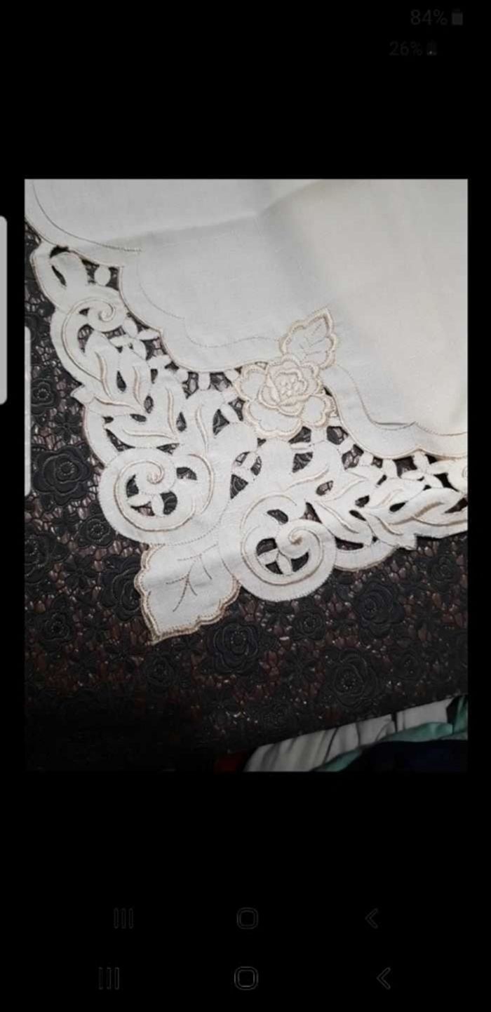 Ensemble comprenant une magnifique nappe avec de très beaux détails. Dimensions : 205 / 145 cm environ . Avec 12 serviettes assorties 44 / 44 cm. En très bon état. 100 % polyester