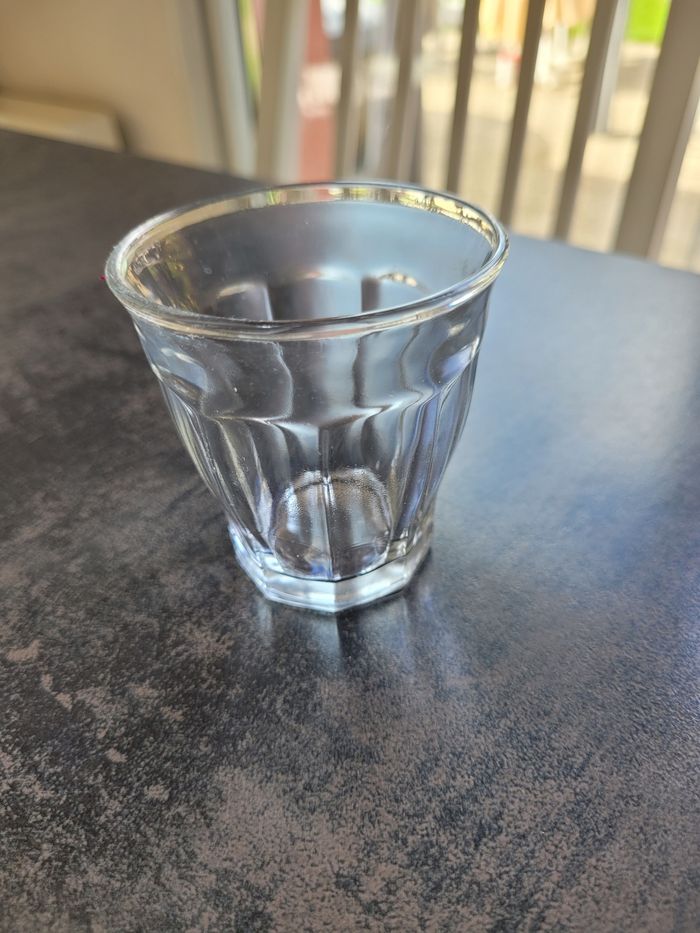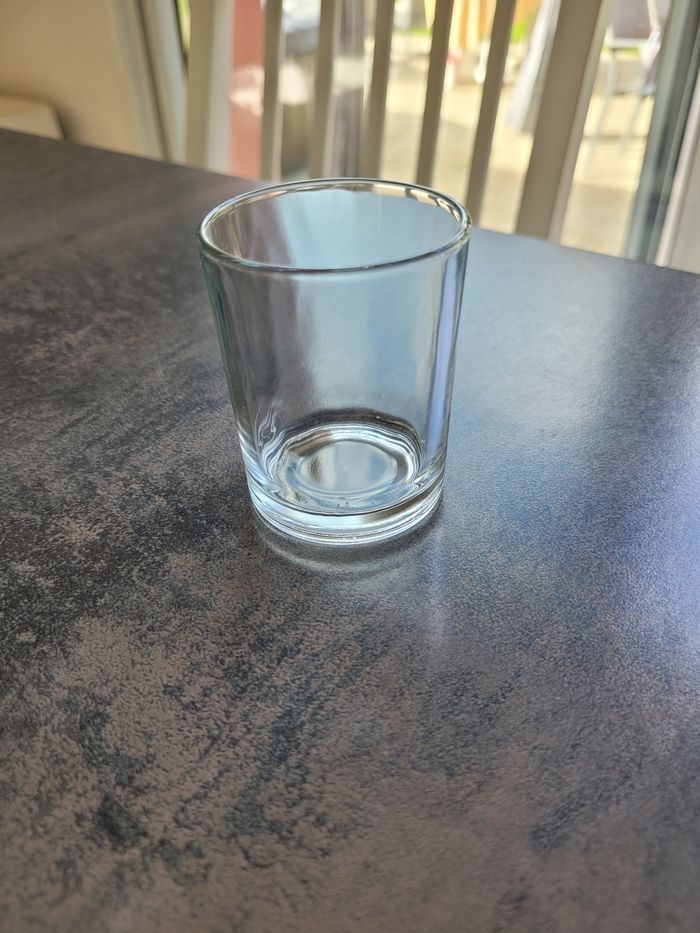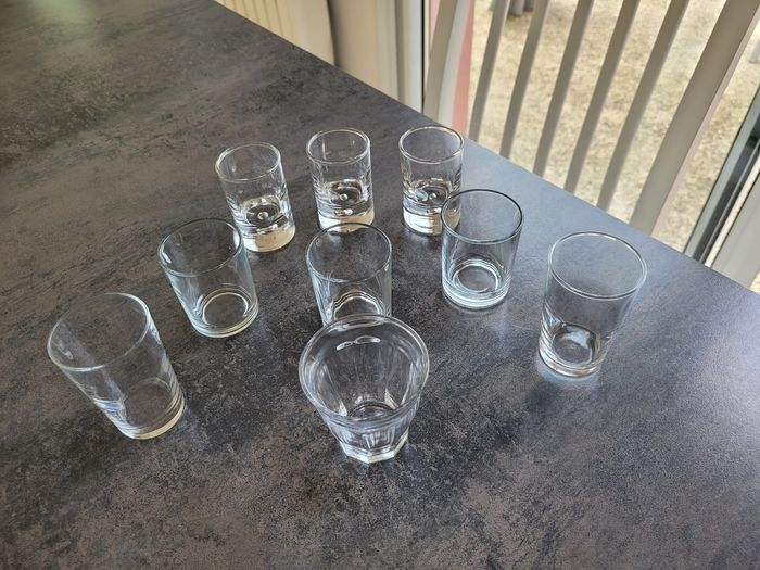 Vends lot de 9 verrines dépareillées. 3 hauteur 6 cm, diamètre 5 cm. 3 hauteur 6,5 cm, diamètre 4 cm. 2 hauteur 7,5 cm, diamètre 4,5 cm. 1 hauteur 6,5 cm, diamètre 6 cm. Excellent état.