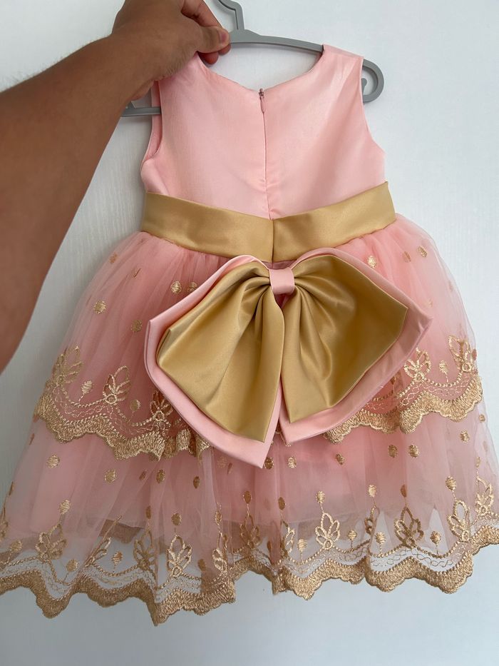 Robe cérémonie rose et doré avec gros noeud a l’arrière clipsable portée pour un shooting photo Taille 18 mois