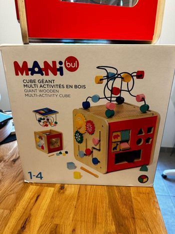 Cube géant multi activités en bois Oxybul complet et dans sa boîte. Neuf / Jamais servi. Complet : 7 jeux en 1 pour développer logique et motricité. Educatif : Développe motricité fine et attention. Malin : Le labyrinthe se retourne pour un rangement optimal. 1 cube d'activités (Dim. : L 29,7 x l 29,7 x H 29,7 cm) avec 4 faces et 1 couvercle avec des activités de chaque côté : - Face 1: 3 engrenages et labyrinthe en bois. - Face 2: 4 palets à tourner imprimés motifs et animaux et boîte à 4 formes. - Face 3: fenêtre transparente. - Face 4: panneau magnétique. Couvercle: 1 côté labyrinthe en métal et perles en bois et 1 côté xylophone. Accessoires: 4 blocs (pyramide, cube, étoile et cylindre), 1 baguette et 5 magnets (voiture, maison, arc en ciel, nuage et soleil). De 1an à 3ans. Prix neuf sur Oxybul : 70€.