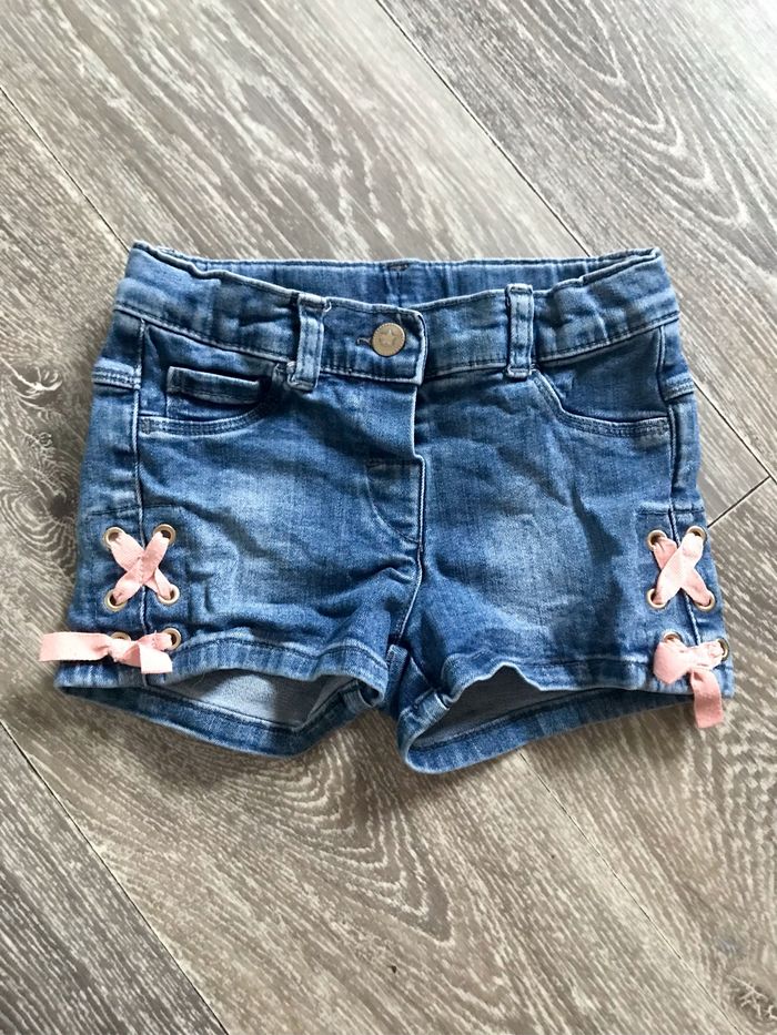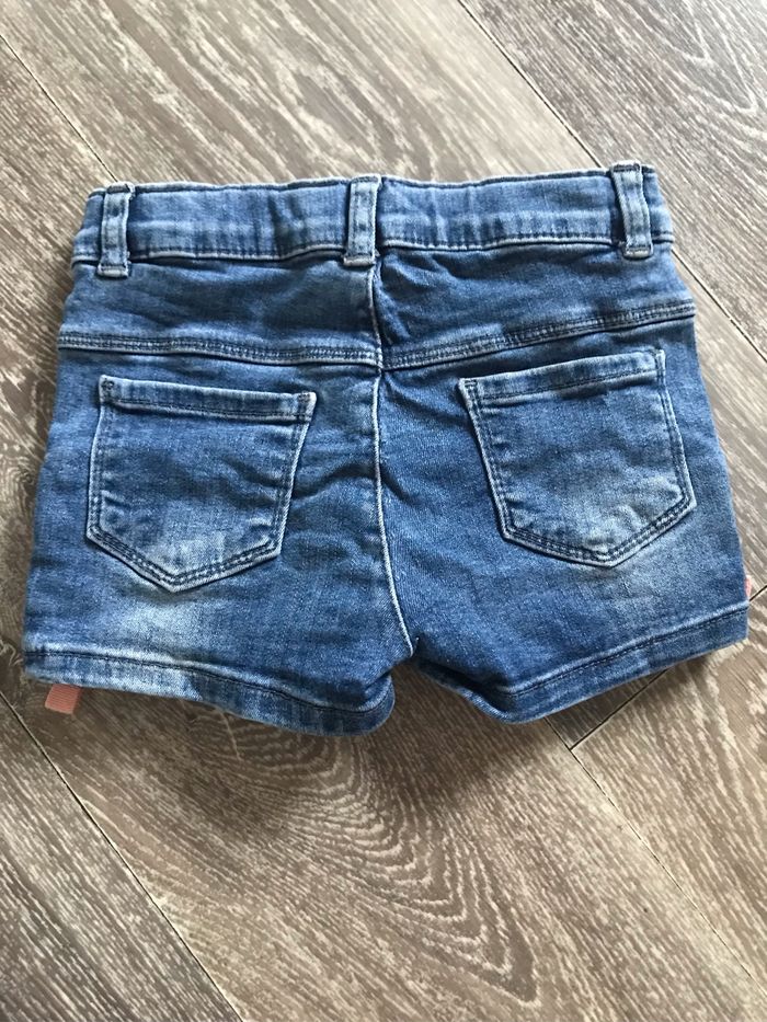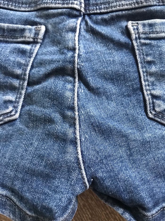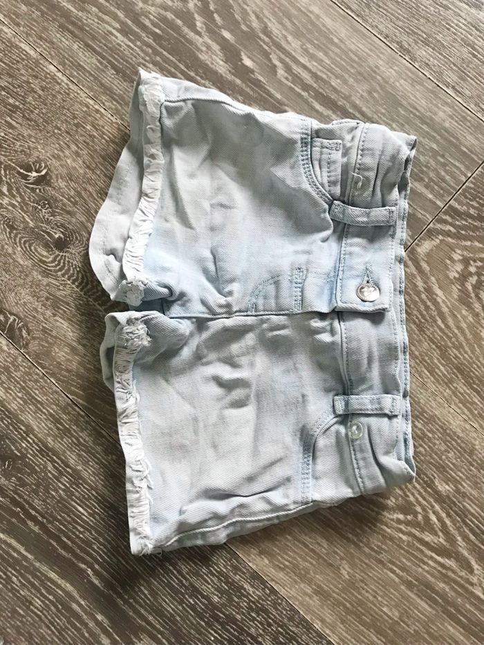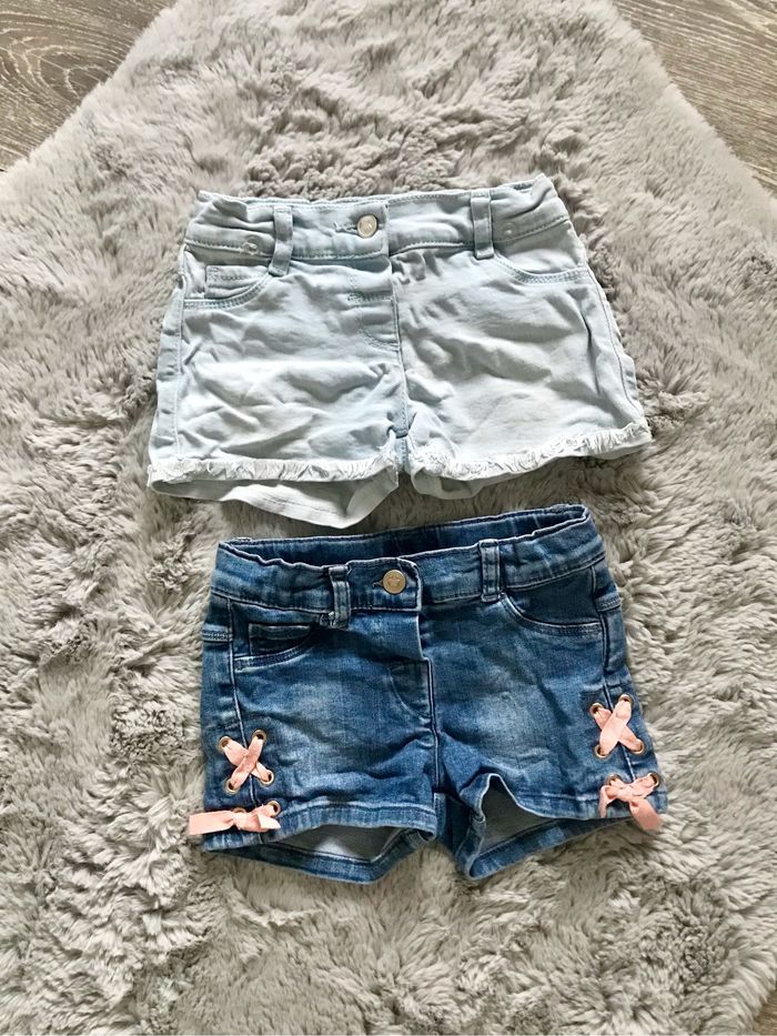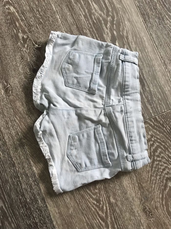 Lot de 2 shorts en jeans Le short en jeans bleu très clair a des tâches claires (non visibles sur les photos malheureusement) Le short en jeans bleu foncé est usé à l’arrière (visible en photo)
