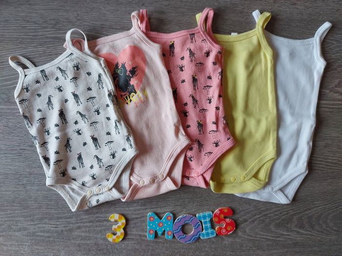 Lot de 5 bodies bretelles. 1 crème avec des animaux, 1 rose pâle avec un cœur, 1 rose avec des animaux, 1 jaune, 1 blanc.