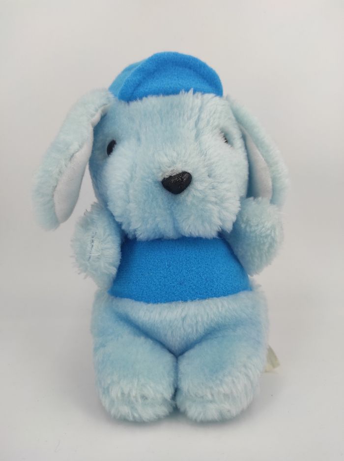 🐕 Peluche Chien bleu avec casquette et t-shirt bleu, vintage, CP Colmar 📏 Dimension : 20 cm environ ✨ Occasion, très bon état 💦 Passage vapeur 🧼 👀 Vous achetez le doudou que vous voyez sur les photos.