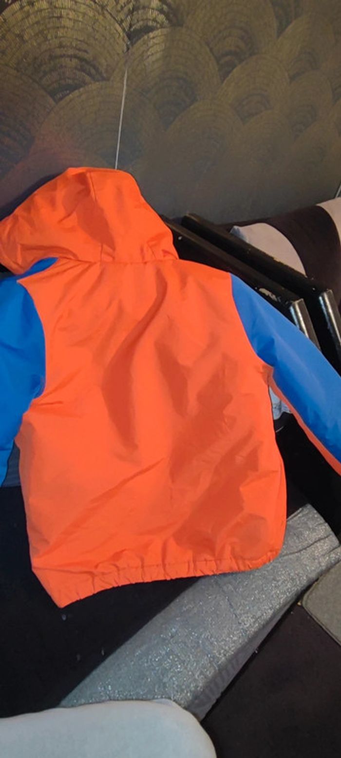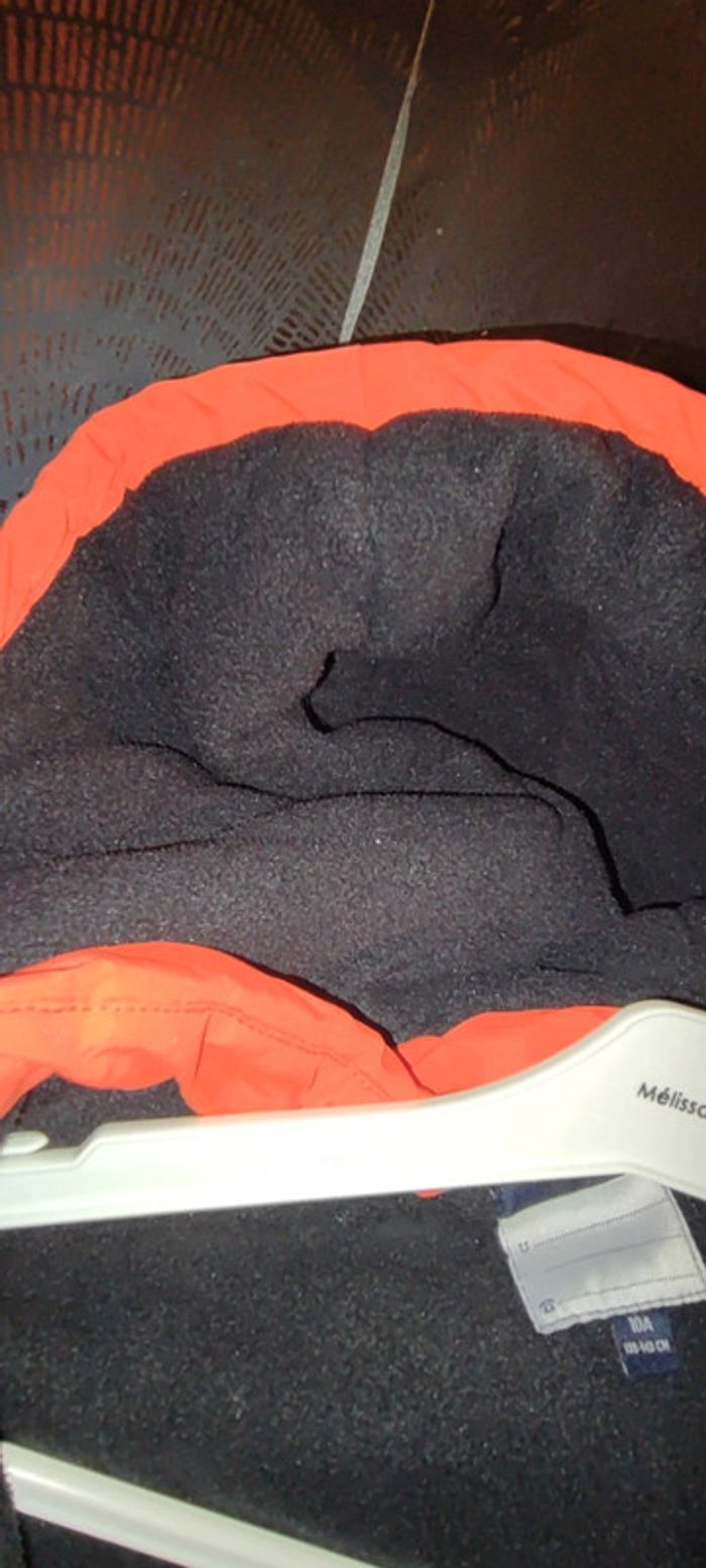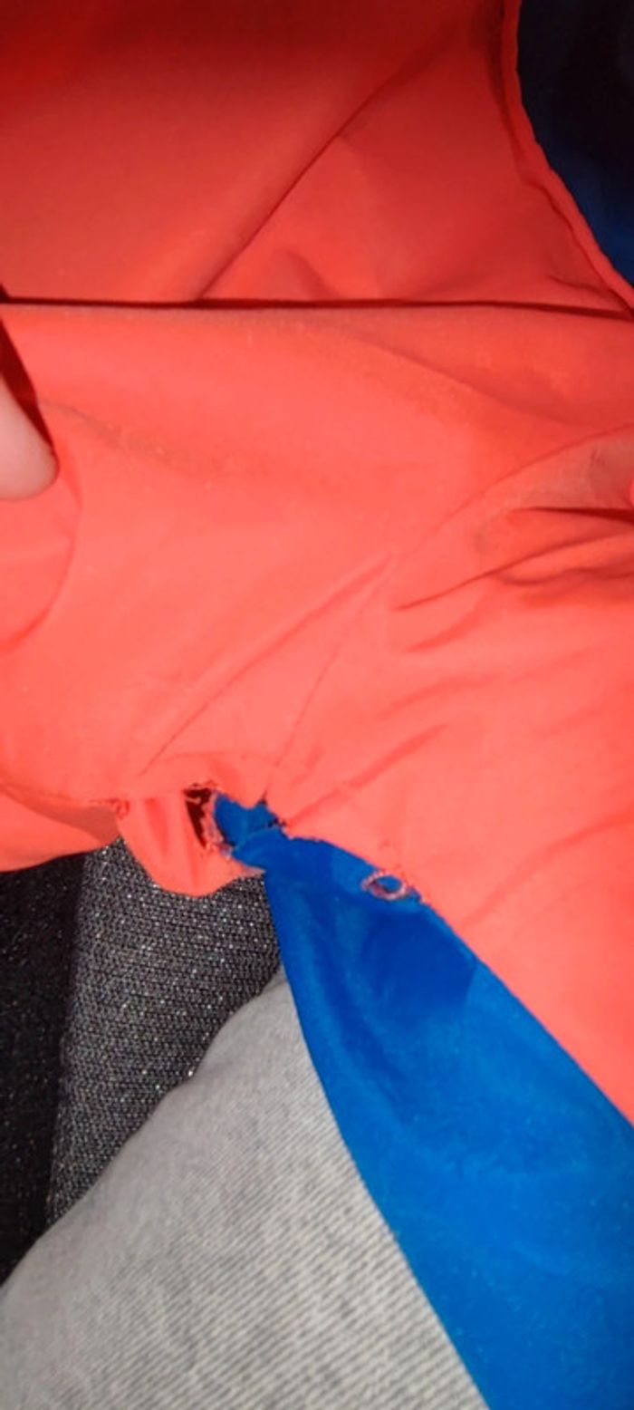 Manteaux garçon taille 10ans marque Kiabi achetez en septembre mes ne va plus a mon fils. De couleur orange bleu avec manche spécial et a intérieure des pression pour maintenir. Il y a des micro tâche doit partir au lavage je n'ose pas mètre en machine il faut également le recoudre en dessous des bras voir photo.