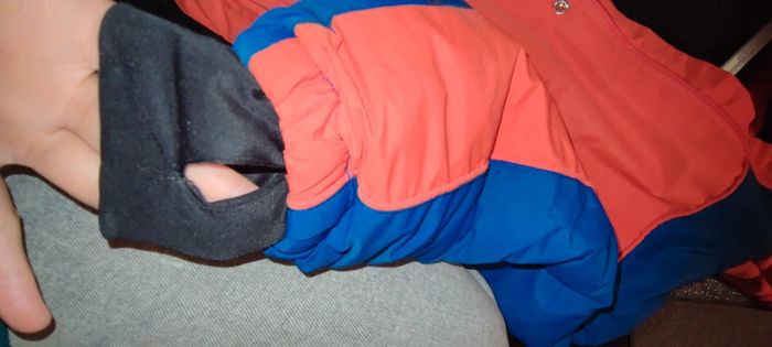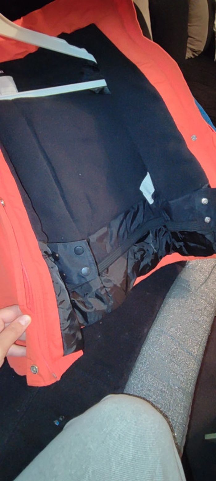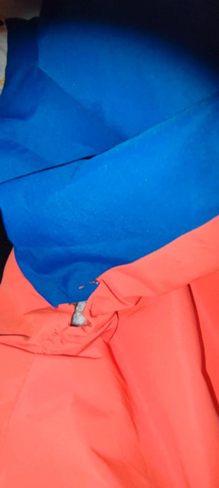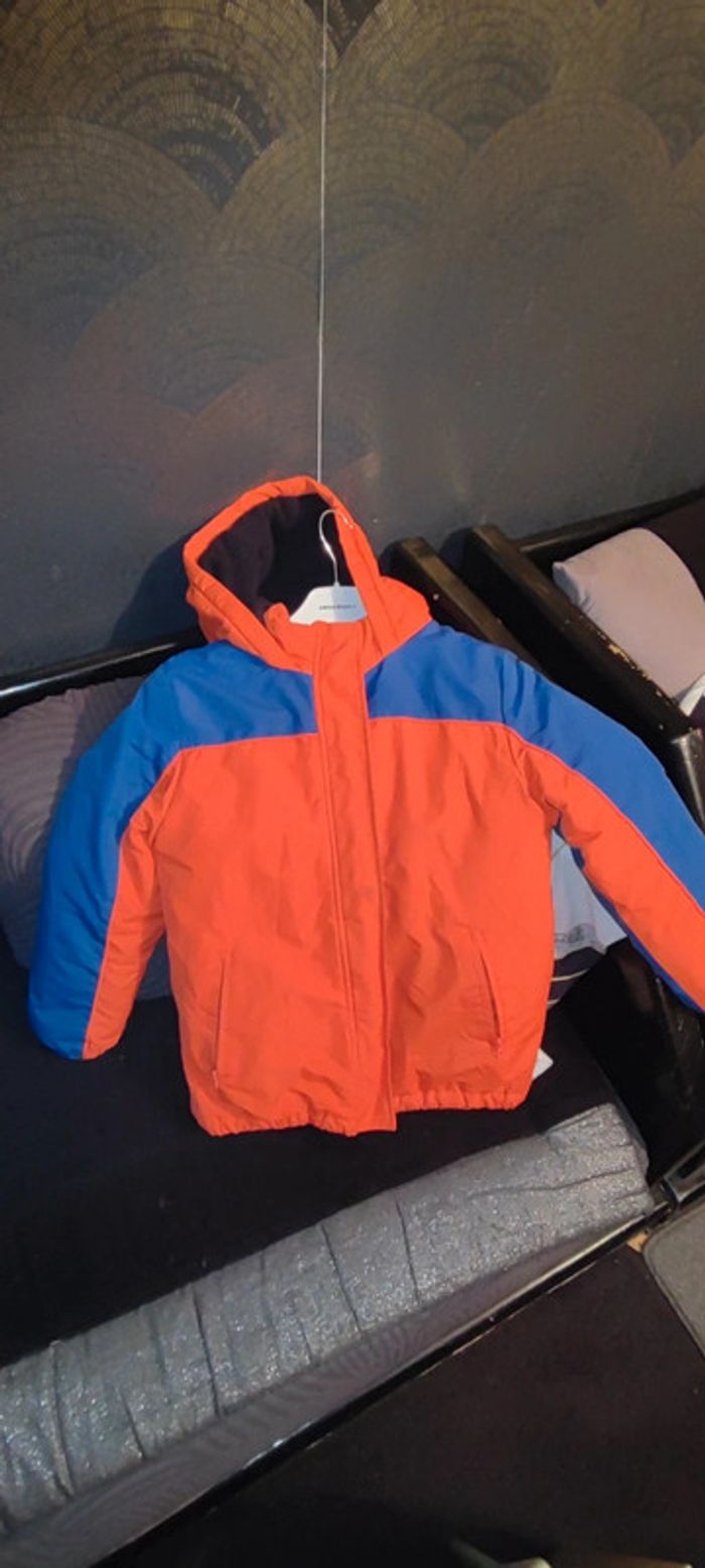 Manteaux garçon taille 10ans marque Kiabi achetez en septembre mes ne va plus a mon fils. De couleur orange bleu avec manche spécial et a intérieure des pression pour maintenir. Il y a des micro tâche doit partir au lavage je n'ose pas mètre en machine il faut également le recoudre en dessous des bras voir photo.