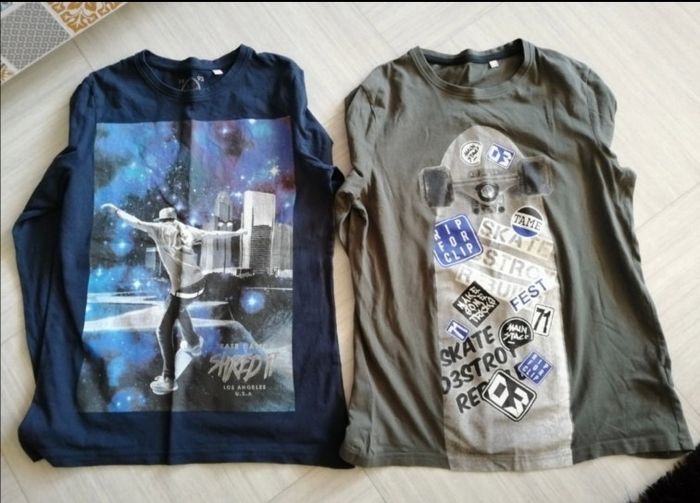 2 tee-shirt manches longues de chez C&A 1 bleu marine et 1 gris. Le bleu est en très bon. Le gris en très bon état hors mis une petite déchirure du tissu au niveau d'une manche. (Voir photo) Taille 14 ans (158/164 cm)