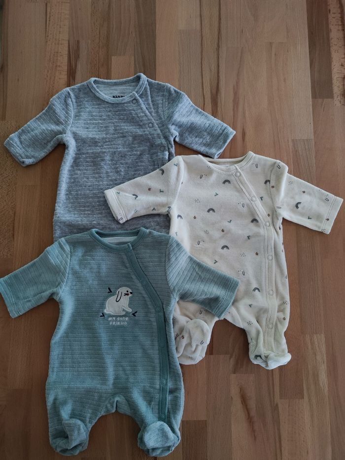 Lot de 3 pyjamas Kiabi en velours taille naissance/ 0 mois / 45-50cm Ouverture pression par devant, idéal pour mettre dans la valise maternité. Peu portés, très bon état D'autres vêtements à vendre sur mon profil !